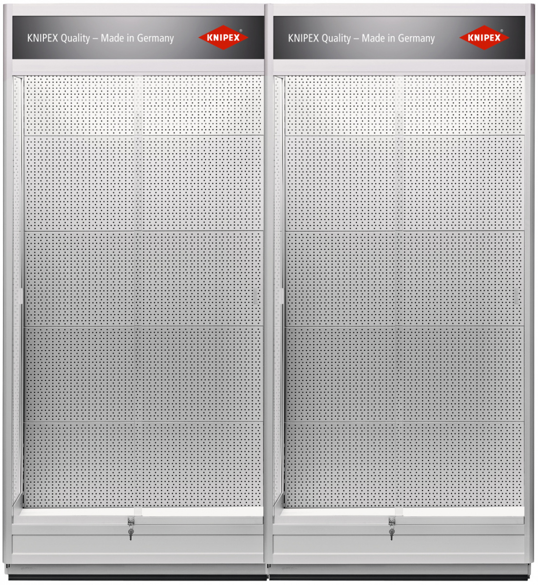 Se dvěma prosklenými dveřmi, uzamykatelnými. S transparentní reklamní lištou. Osvětlovací jednotka s propojovací zástrčkou pro montáž do řady. Pro elektrickou přípojku 230 voltů. Kvalitní hliníková/skleněná konstrukce. Dvojitá vitrína pro montáž na stěnu s děrovanými deskami. s stropní deskou a transparentním reklamní tabulí.