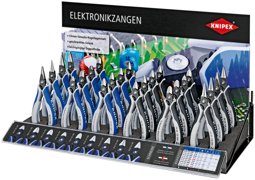 Dodání bez výbavy. Stabilní kovový korpus s vyměnitelnou pěnovou vložkou. Stabilní provedení, vhodné k upevnění na děrované stěny i jako pultový stojan. Vhodný pro 24 přesných kleští na elektroniku 34 / 79. Včetně horního štítku a cenové lišty. Stojan k dostání při odběru 24 přesných kleští na elektroniku.