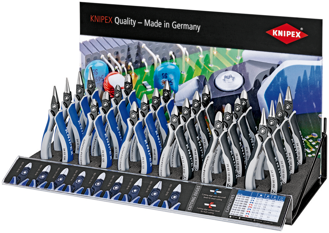 Dodání bez výbavy. Stabilní kovový korpus s vyměnitelnou pěnovou vložkou. Stabilní provedení, vhodné k upevnění na děrované stěny i jako pultový stojan. Vhodný pro 24 přesných kleští na elektroniku 34 / 79. Včetně horního štítku a cenové lišty. Stojan k dostání při odběru 24 přesných kleští na elektroniku.