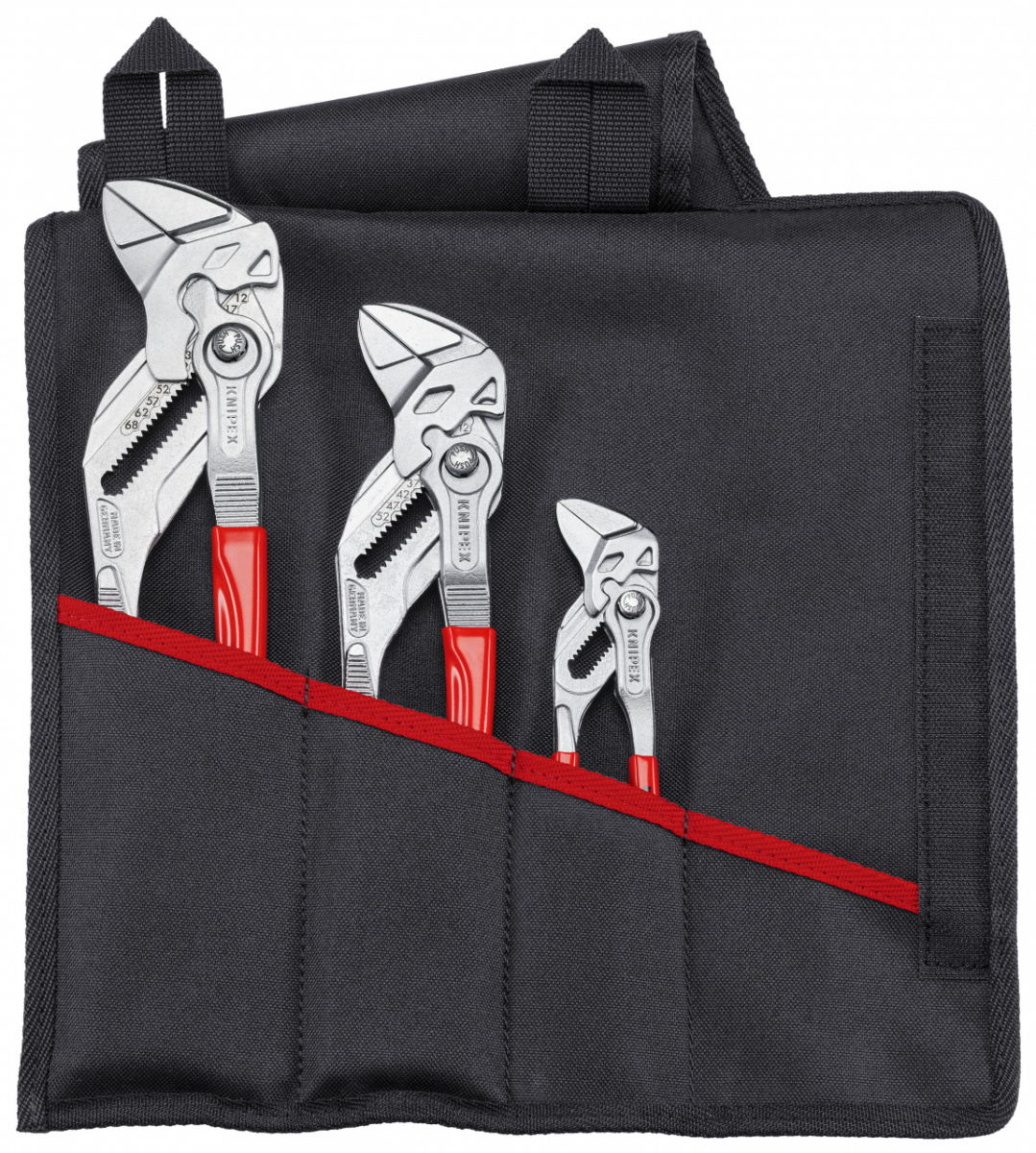 Klešťové klíče od společnosti KNIPEX se dokonale hodí pro citlivý úchop, držení, stisk a ohýbání součástí, každý z klíčů nahradí celou sadu běžných klíčů. Praktická odolná polyesterová svinovací taška na nářadí zajišťuje ochranu nářadí a díky suchému zipu máte vše po ruce.. Každá sada obsahuje tři různě velké klešťové klíče s rukojeťmi potaženými tenkým plastem. Jako u většiny klešťových klíčů KNIPEX, i jejich jemné souběžné čelisti umožňují pevný, ale citlivý úchop – dokonce i u chromovaných dílů!.
