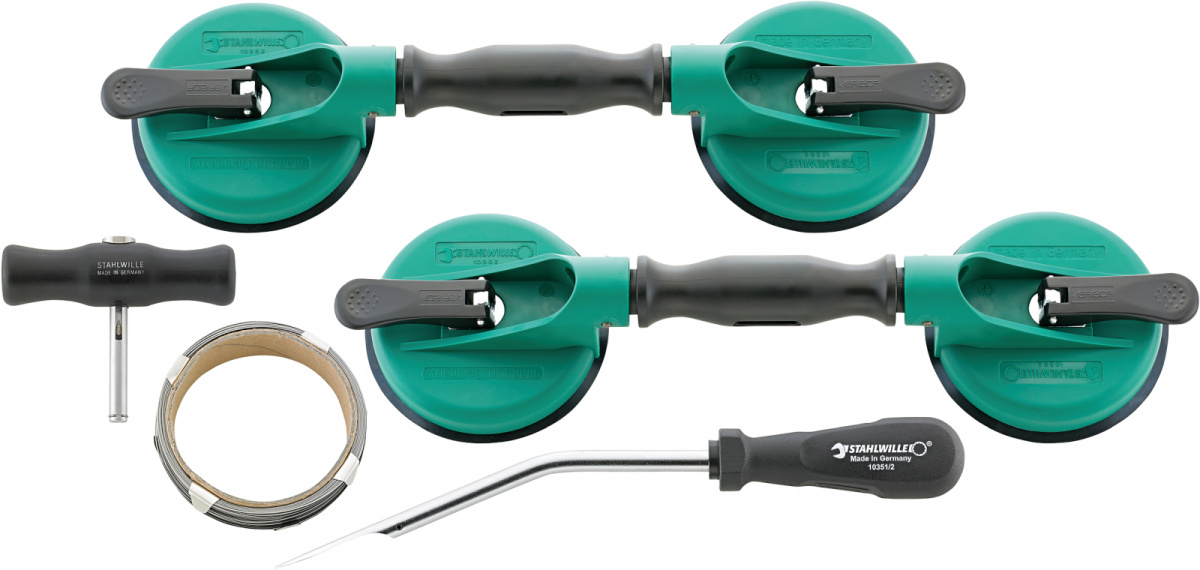 Souprava pro vyjmutí předního skla 1 ks napínací rukoje 1 ks kontra drák 1ks cívka speciálního řezacího drátu (50 m) 2 ks dvojitá vákuová přísavka na zvedání skla.