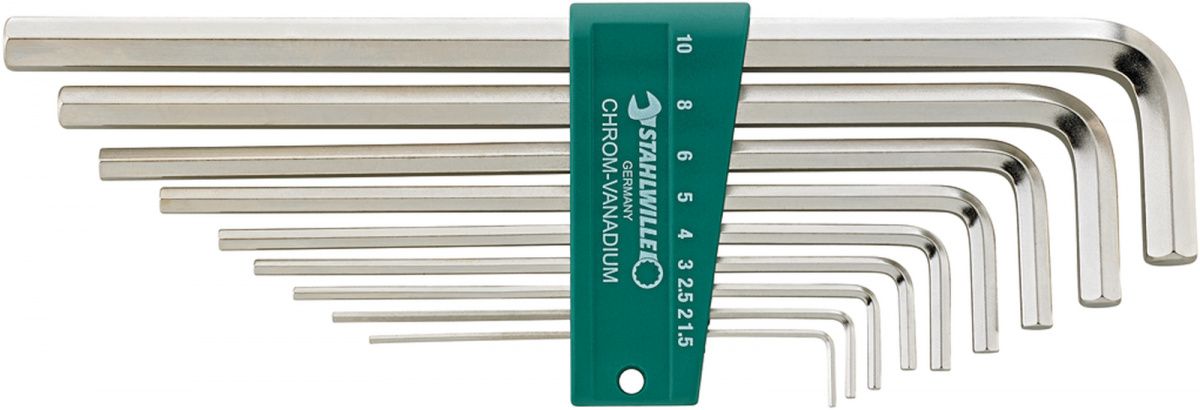 Sada úhlových imbusových šroubováků pro šrouby vnitřním šestihranem, DIN ISO 2936, prodloužené provedení, v pouzdře, chrom-vanad, poniklované.