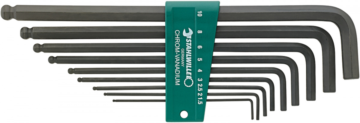 Sada úhlových imbusových roubováků s kuličkovým koncem v pouzdře, chrom-vanad, černěné.