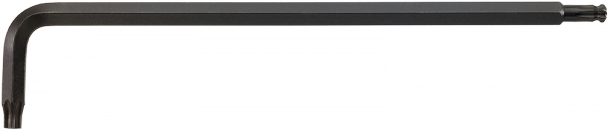 Úhlový imbusový šroubovák, pravoúhlý pro šrouby s vnitřním TORX®, prodloužené provedení, kulová hlavice na konci dlouhé stopky, úhel natočení 25°na obě strany, chrom-vanad, černěný.