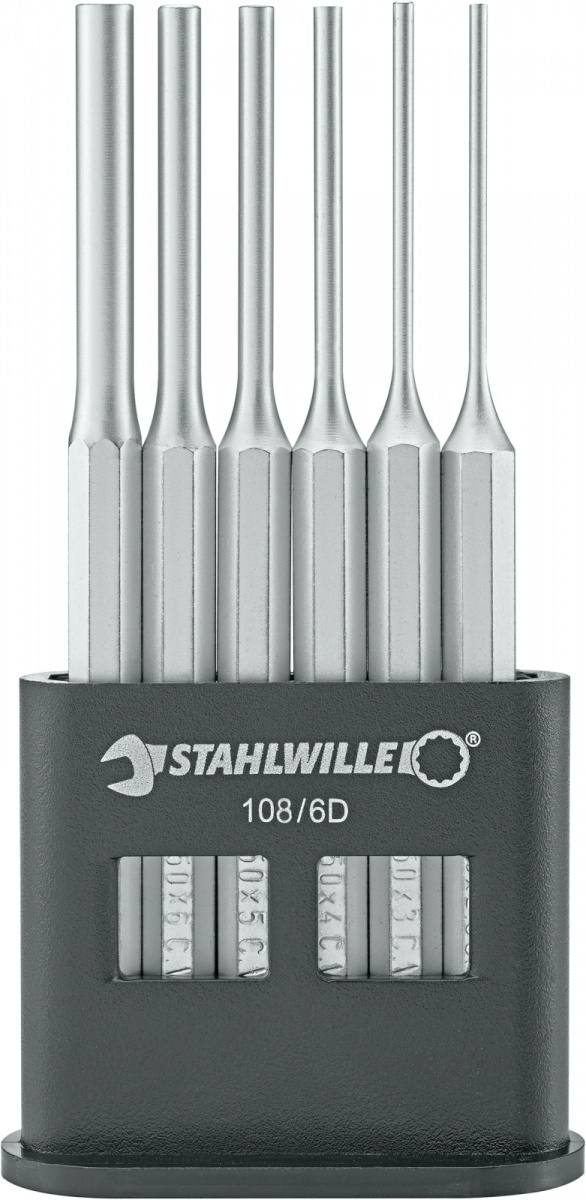 Sada vyráečů kolíků 6-dílná sada. Obsah: po 1ks č. 108/150 x 2,5; 150 x 3; 150 x 4; 150 x 5; 150 x 6; 150 x 8 mm D = v pouzdře z umělé hmoty T = v textilní tace