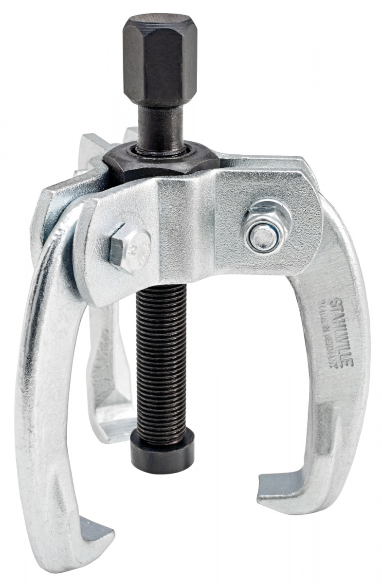 Stahovák plochých svorek trojramenný, s automaticky centrovaným rychlonapínaním a s automatickým nastavovaním uchycení; pouitelné pro stahování svorek pólů baterií, malých kuličkových loisek, řemenic atd.; při nastavování vřetenového tlaku stahovací ramena zachytávají stahovanou součástku stále narůstající silou; díky kompaktnímu provedení a tíhlým stahovacím ramenům se dá výhodně pouívat v rámci údrbářských a opravných prací u autoelekriky, pneumatice a v podobných oblastech.