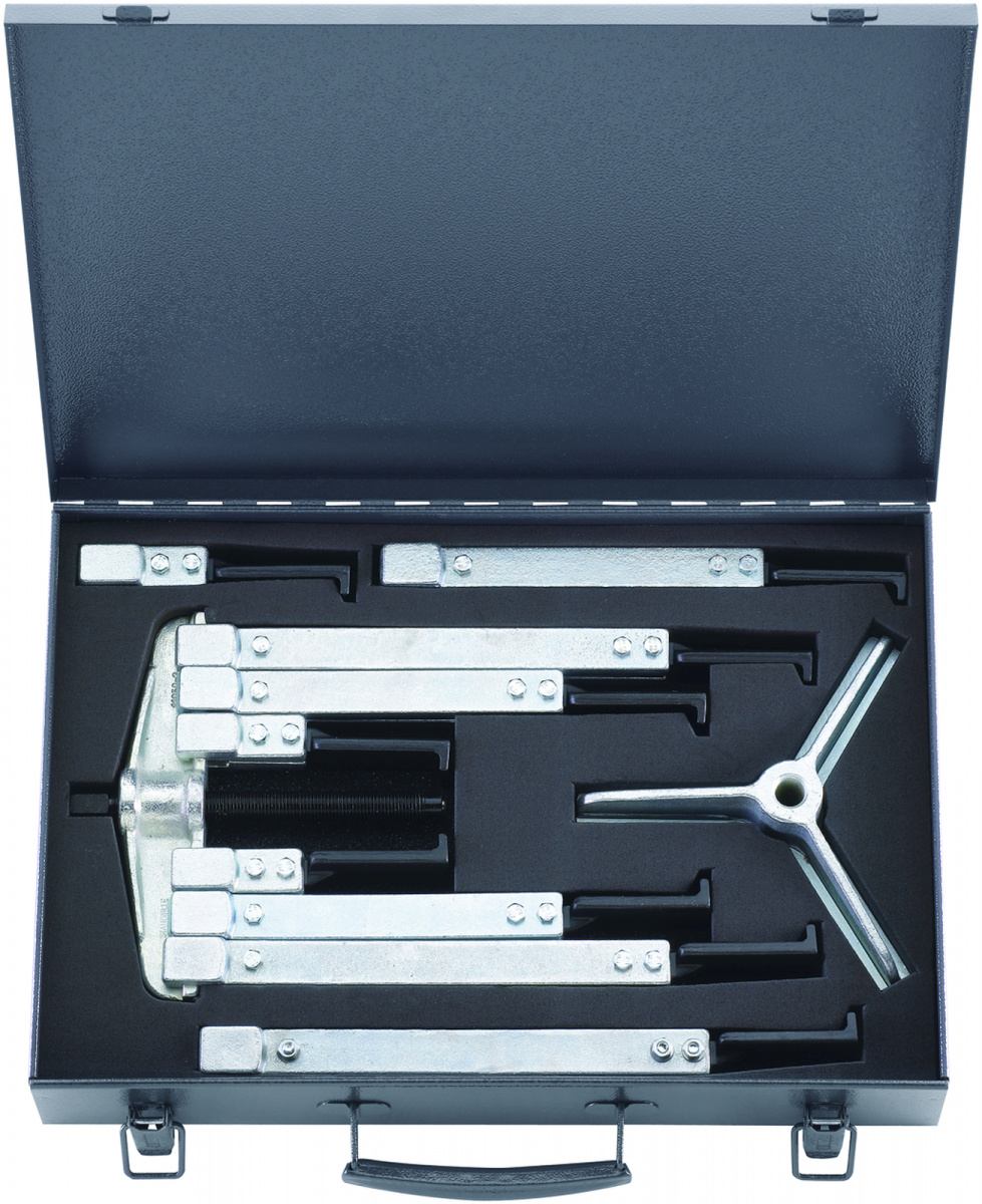 Stahovací sada Sada se skladá z osvědčených, a vyhledávaných dvoj a trojramenných stahováků, se dvěma a třemi paralelně posuvatelnými stahovacími háky. Slouí pro stahování ozubených kol, kuličkových loisek, řemenic a podobných dílců z hřídele či z nápravy; změnou uspořádání stahovacích ramen je vyuitelný jako vnějí, tak i jako vnitřní stahovák; vlivem velkého silového účinku pák, háky pevně zachycující stahovaný dílec.