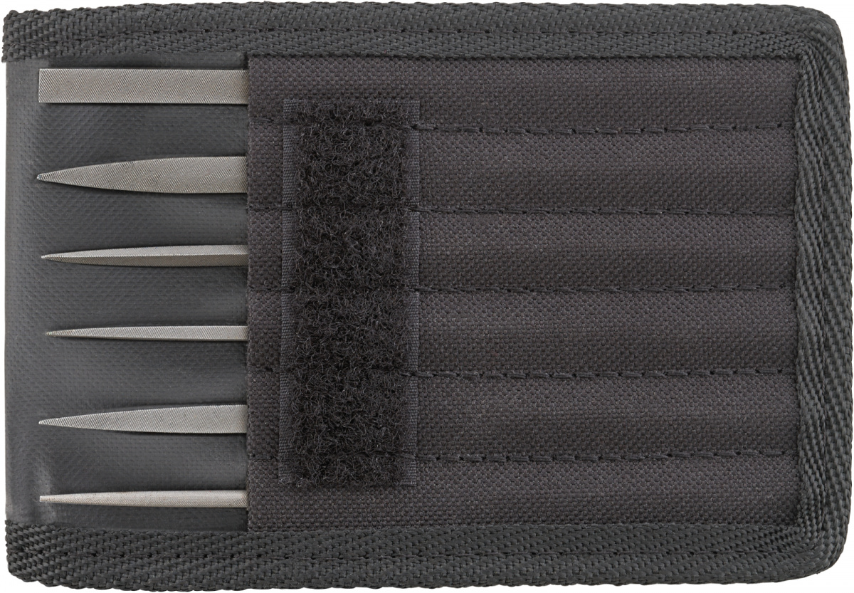Sada jehlových pilníků 6-dílná, v textilní tace. Obsah: po 1 ks kruhový, půlkruhový, trojhranný, čtyřhranný, plochý tupý a plochý pičatý pilník
