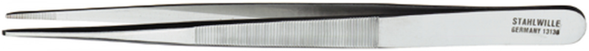 Pinzeta rovná, se zaoblenými picemi, čelisti jemně zoubkované, speciální nerezová ocel.
