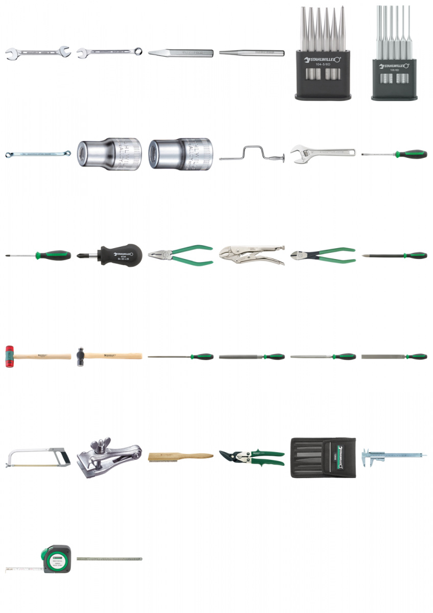 Sada nářádí na opracovávání kovů Obsahuje 53 kusů nářadí --------------------------------------------------------------------------------------------------------------------------------------------- Č. 10a rozměr klíče 1/4 x 5/16; 3/8 x 7/16; 1/2 x 9/16" Č. 13a rozměr klíče 7/32; 11/32" Č. 230a rozměr klíče 1/4 x 5/16; 3/8 x 7/16; 1/2 x 9/16" Č. 4025 velikost 8 Č. 442 1/4" [b 3/8" [a Č. 443 5/16" [b 3/8" [a Č. 453 3/8" [D Č. 103 150 mm Č. 104-5/6D Č. 104/120 x 2; 120 x 3; 120 x 4; 120 x 5; 120 x 6 mmČ. 105/120 mm Č. 104 120 x 8 mm Č. 108/6D Č. 108/150 x 2,5; 150 x 3; 150 x 4; 150 x 5; 150 x 6; 150 x 8 mm Č. 4622 velikost 1 (1,0 x 5,5 x 100 mm)velikost 3 (1,2 x 8,0 x 150 mm)velikost 4 (1,6 x 10,0 x 175 mm)velikost 6 (2,5 x 14,0 x 250 mm) Č. 4630 velikost 1; 2; 3 Č. 4734 velikost 2 Č. 65 01 6 180 Č. 65 64 2 175 Č. 66 02 6 160 Č. 10670 265 mm Č. 10955 32 mm [O Č. 10970 3/4; 1 1/2 lb. Č. 12025 210 mm Č. 12030 260 mm Č. 12035 210 mm Č. 12036 260 mm Č. 12050 465 mm Č. 12200 145 mm Č. 12378 Č. 12752R Č. 12800 Č. 12900N Č. 12931 3 m Č. 13110 300 mm ---------------------------------------------------------------------------------------------------------------------------------------------