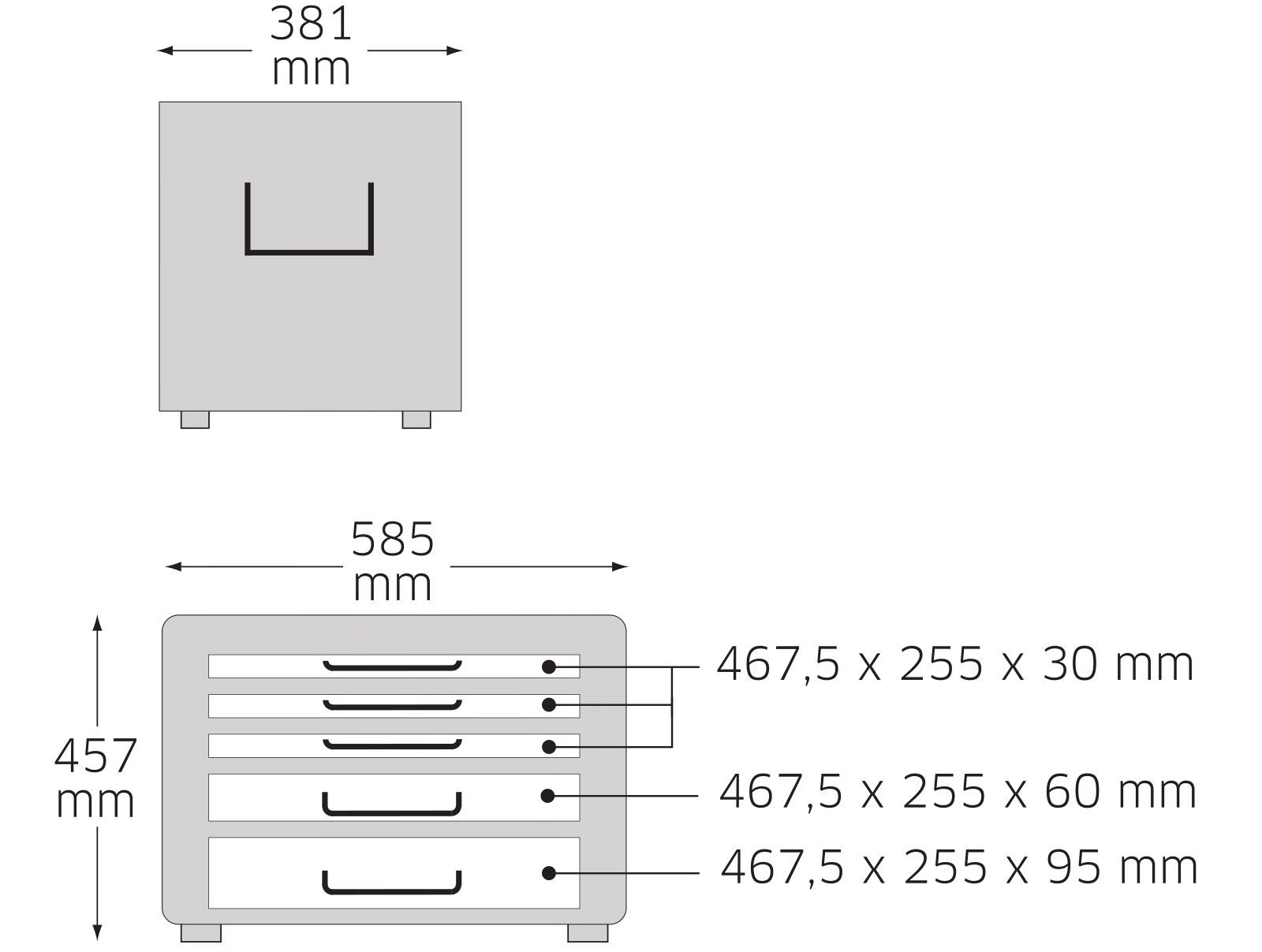 Vozík na nářadí Extremely sturdy, tool trolley resilient to loads and made of polypropylene for professional use. 5 easily removed lockable drawers with transparent covers, with endstops for the extendible rails, 3 different drawer heights. Drawers can be inserted in any order. With one top cover and one front cover, both folding. The top cover is fitted with napped foam to hold tools firmly in place. One removable tray with 2 handles and 2 transparent drawer covers under the top cover. Drawers can be used as separate tool boxes using the transparent cover. Tool case and drawers can be individually marked. 2 smooth-running twin castors on the telescopic-handle side Adaptable for vertical transport using 4 castors, R 13217 Set of castors (please order separately). Extendible telescopic handle facilitates transport. 2 carrying handles at the sides. Resistant to Skydrol, acetone, petrol and hydraulic fluids. Carrying capacity 60 kg. 3 locking positions with padlock. Also available as IP67 version (6 drawers, 4 x 30 mm, 2 x 60 mm). Additional catches and seals protect against water and dust. Special valve for pressure relief. Also available with all-round high-visibility reflecting surface (5 drawers, 2 x 30 mm, 3 x 60 mm), for increased safety when working in dark surroundings. Individually tailored cases are available on request