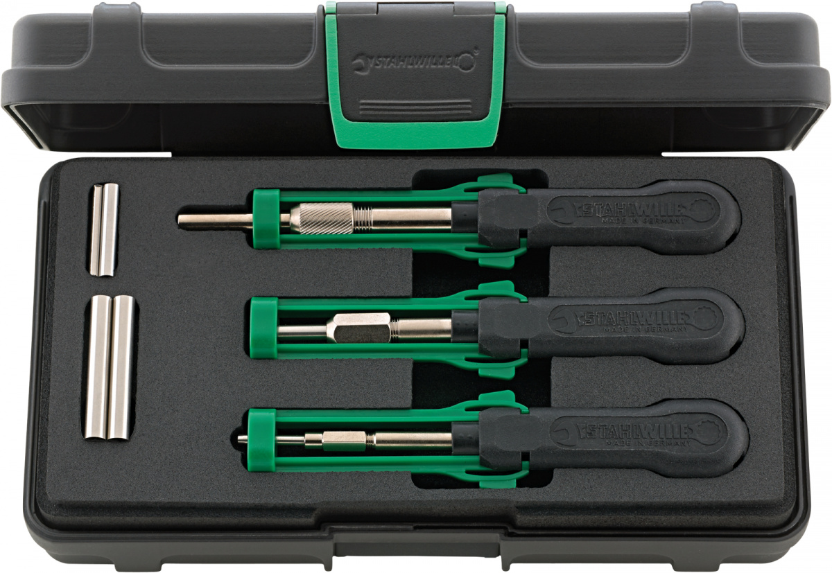 Sada nářadí KABELEX® 10-dílná pro kruhové konektorové spoje (včetně ABS). Obsah: 1 ks č. 1501: výtlačné nářadí pro rozměry kontaktů průměru [O 1,5 mm 1 ks č. 1502: výtlačné nářadí pro rozměry kontaktů průměru [O 3,5 mm 1 ks č. 1503: výtlačné nářadí pro rozměry kontaktů průměru [O 4,0 mm ABS montání pouzdro resp. pouzdro demontáe 2 ks č. 1511: pouzdro demontáe pro kontakty rozměru [O 1,5 mm (namontovaný 1 ks) 2 ks č. 1512: pouzdro demontáe pro kontakty rozměru [O 3,5 mm (namontovaný 1 ks) 2 ks č. 1513: pouzdro demontáe pro kontakty rozměru [O 4,0 mm (namontovaný 1 ks) 1 ks č. 1523: Montání pouzdro (ABS)