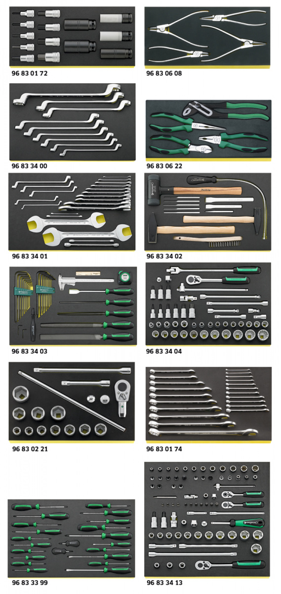 Dílenská sada pro nákladní vozidla Mercedes - Benz 264 Werkzeuge, in TCS-Einlagen, 3x1/3, 1x2/3 und 8x3/3 Einlagen für 10 Schubladen (Nr. 98VA für 5 Schubladen). --------------------------------------------------------------------------------------------------------------------------------------- Nr. 10 SW 6 x 7; 8 x 9; 10 x 11; 12 x 13; 14 x 15; 16 x 17; 18 x 21; 19 x 22; 24 x 27; 30 x 32; 34 x 36; 36 x 41 mm Nr. 13 SW 6; 7; 8; 9; 10; 11; 12; 13; 14; 15; 16; 17; 18; 19; 21; 22; 24; 27; 30; 32; 34 mm Nr. 20 SW 6 x 7; 8 x 9; 10 x 11; 12 x 13; 14 x 15; 16 x 17; 18 x 19; 20 x 22; 21 x 23; 24 x 26; 25 x 28; 27 x 32; 30 x 32; 36 x 41 mm Nr. 40 1/4" [a SW 4; 5; 5,5; 6; 7; 8; 9; 10; 11; 12; 13; 14 mm Nr. 41K 1/4" [a, [r 0,6 x 3,5; 1,0 x 5,5; 1,2 x 8 mm Nr. 44K 1/4" [a, [E 3; 4; 5; 6; 8 mm Nr. 44P 1/4" [a, [k Gr. 1; 2 Nr. 44PZ 1/4" [a, [l Gr. 1; 2 Nr. 400 1/4" [D 150 mm Nr. 404 1/4" [D 116 mm Nr. 405/2 1/4" [D [a 54 mm Nr. 405/6 1/4" [D [a 150 mm Nr. 407 1/4" [D [a 38 mm Nr. 409 3/8" [D 1/4" [a Nr. 412 1/4" [b [a Nr. 415 1/4" [D Nr. 415B 1/4" [b Nr. 456 3/8" [a SW 10; 11; 12; 13; 14; 15; 16; 17; 18; 19; 21; 22 mm Nr. 427/3 3/8" [D [a 76 mm Nr. 427/6 3/8" [D [a 160 mm Nr. 427/10 3/8" [D [a 240 mm Nr. 428 3/8" [D [a 46 mm Nr. 431 1/4" [D 3/8" [a Nr. 432 1/2" [D 3/8" [a Nr. 435 3/8" [D Nr. 442 1/4" [b 3/8" [a Nr. 50 1/2" [a SW 10; 11; 12; 13; 14; 15; 16; 17; 18; 19; 20; 21; 22; 23; 24; 26; 27; 28; 30; 32; 34 mm Nr. 54 1/2" [a SW 5; 6; 7; 8; 10; 12; 14; 17; 19 mm Nr. 51IMP 1/2" [a SW 24; 27 mm Nr. 2309 1/2" [a SW 22 mm Nr. 2309K 1/2" [a SW 17; 19 mm Nr. 54X 1/2" [a Gr. M6; M8; M10; M12; M14; M16 Nr. 509/2 1/2" [D [a 52 mm Nr. 509/5 1/2" [D [a 130 mm Nr. 509/10 1/2" [D [a 255 mm Nr. 509W/2 1/2" [D [a 52 mm Nr. 509W/5 1/2" [D [a 130 mm Nr. 509W/10 1/2" [D [a 255 mm Nr. 504/15 1/2" [D 397 mm Nr. 506 1/2" [D 300 mm Nr. 510 1/2" [D [a 71 mm Nr. 512 1/2" [D Nr. 513 3/8" [D 1/2" [a Nr. 514 3/4" [D 1/2" [a Nr. 55 3/4" [a SW 22; 24; 27; 30; 32; 34; 36; 38; 41; 46; 50 mm Nr. 552 3/4" [D Nr. 556 3/4" [D Nr. 559/8 3/4" [D [a 200 mm Nr. 559/16 3/4" [D [a 400 mm Nr. 558 510 mm Nr. 568 1/2" [D 3/4" [a Nr. 21TX Gr. E6 x E8; E10 x E12; E14 x E18; E20 x E24 Nr. 40TX 1/4" [a Gr. E4; E5; E6; E7; E8 Nr. 45TX 3/8" [a Gr. E10; E12; E14 Nr. 49TX 3/8" [a Gr. T40; T45 Nr. 50TX 1/2" [a Gr. E11; E16; E18; E20; E24 Nr. 54TX 1/2" [a Gr. T50; T55; T60 Nr. 1410 Gr. T6 Nr. 1411 Gr. T7 Nr. 1412 Gr. T8 Nr. 1413 Gr. T9 Nr. 1440 Gr. T10 Nr. 1441 Gr. T15 Nr. 1442 Gr. T20 Nr. 1443 Gr. T25 Nr. 1444 Gr. T27 Nr. 1445 Gr. T30 Nr. 1446 Gr. T40 Nr. 1427 Gr. T25 (65 mm) Nr. 4620 Gr. 1 (0,6 x 3,5 x 75 mm)Gr. 2 (0,8 x 4,0 x 100 mm)Gr. 4 (1,2 x 6,5 x 150 mm) Nr. 4621 Gr. 1 (0,5 x 3,5 x 90 mm)Gr. 2 (1,2 x 8,0 x 160 mm) Nr. 4630 Gr. 1; 2; 3 Nr. 4640 Gr. PZ1; PZ2 Nr. 4650 Gr. T6; T7; T8; T9; T10; T15; T20; T25; T27; T30 Nr. 4724 Gr. 2 (1,0 x 5,5 x 25 mm) Nr. 4734 Gr. 2 Nr. 10766 Gr. T6; T7 Nr. 10767/9 SW 1,5; 2; 2,5; 3; 4; 5; 6; 8; 10 mm Nr. 10771/8 Gr. T9; T10; T15; T20; T25; T27; T30; T40 Nr. 65 01 5 180 Nr. 65 29 5 200 Nr. 65 43 4 002 Nr. 65 44 4 021 Nr. 65 45 4 002 Nr. 65 46 4 021 Nr. 65 72 6 240 Nr. 66 02 5 160 Nr. 102 150; 200 mm Nr. 105 120 x 12 mm Nr. 108 150 x 3; 150 x 4; 150 x 5; 150 x 6; 150 x 8 mm Nr. 10669 Nr. 10957 [O 50 mm Nr. 10960 500; 1000 g Nr. 12025 210 mm Nr. 12030 260 mm Nr. 12035 210 mm Nr. 12036 260 mm Nr. 12374 Nr. 12600 3000 g Nr. 12718 Nr. 12900N Nr. 12900/3 Nr. 12935/3 3 m ---------------------------------------------------------------------------------------------------------------------------------------