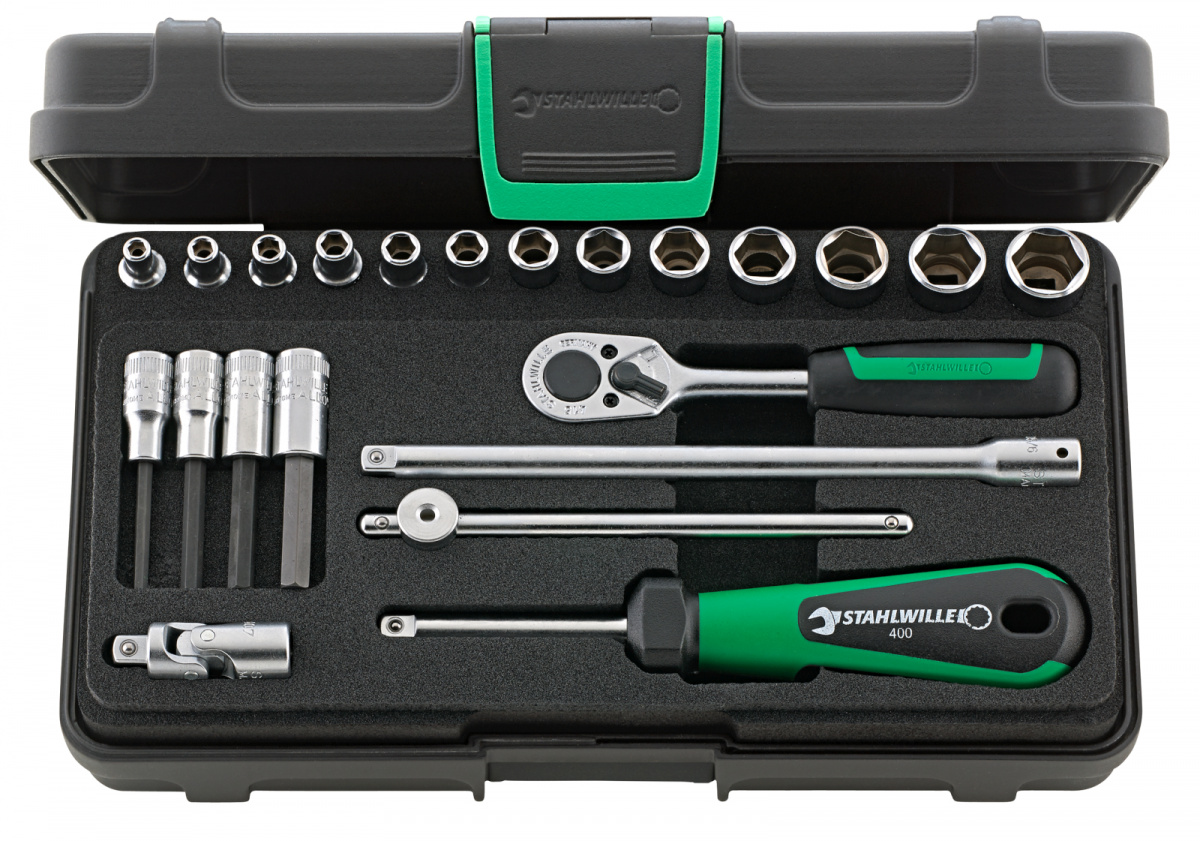 Sada nástrčných klíčů 1/4" [u v robustní, stohovatelném boxu z plastu ABS, 22-dílna Obsah: 13 kusů nástrčná hlavice se estihranným otvorem č. 40: rozměr klíče 3,5; 4; 4,5; 5; 5,5; 6; 7; 8; 9; 10; 11; 12; 13 mm 4 kusy INHEX hlavic č. 44: rozměr klíče 3, 4, 5, 6 mm 1 kus ráčňa č.415 1 kus prodluovací díl č. 405/6 (150 mm) 1 kus kardanový kloub č. 407 1 kus zásuvná rukoje č. 400 1 kus kříová rukoje č. 404