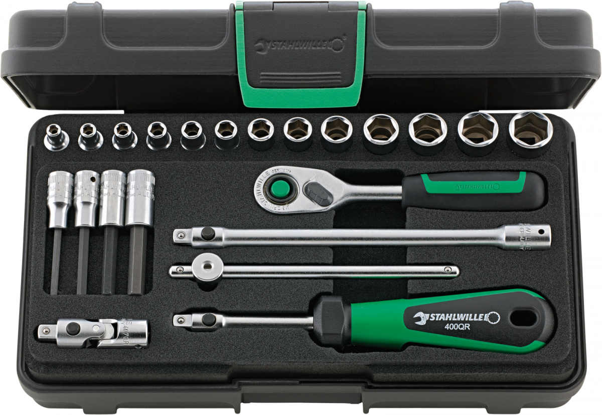 Sada nástrčných klíčů 1/4" [u v robustní, stohovatelném boxu z plastu ABS, 22-dílná Obsah: 13 kusů nástrčná hlavice se estihranným otvorem č. 40: rozměr klíče 3,5; 4; 4,5; 5; 5,5; 6; 7; 8; 9; 10; 11; 12; 13 mm 4 kusy INHEX-hlavice č.44: rozměr klíče 3, 4, 5, 6 1 ks ráčna č. 415QR N1 kus prodluovací díl č. 405QR/6 (150 mm) 1 kus kardanový kloub č. 407QR 1 kus zástrčná rukoje č. 400QR 1 kus kříová rukoje č. 404QR