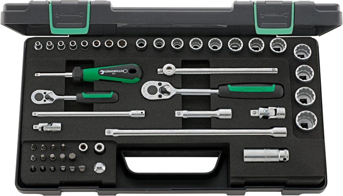 Sada nástrčných klíčů 1/4; 3/8" [u v robustní, stohovatelném boxu z plastu ABS, 48-dílná Obsah: 8 ks nástrčná hlavice se estihranem č. 40: rozměr klíče 4; 5; 5,5; 6; 7; 8; 9 mm 12 ks nástrčná hlavice s dvojitým estihranem č. 45 rozměr klíče 10; 11; 12; 13; 14; 15; 16; 17; 18; 19; 21; 22 mm 1 ks nástrčná hlavice s dvojitým estihranem, prodlouená, s gumovou vlokou, č. 4600: rozměr klíče 16 mm - 5/8" 3 ks bit [k č. 1221: velikost 1; 1222: velikost 2; 1223: velikost 3 1 ks bit [l č. PZ1222: velikost 2 6 ks bit [r 1160: 0,5 x 3 mm; 1162: 0,6 x 3,5 mm; 1164: 0,8 x 4 mm; 1166: 1 x 5,5 mm; 1166/1: 1,2 x 6,5 mm; 1168: 1,6 x 8 mm 5 ks bit [i č.1300: 3 mm; 1301: 4 mm; 1302: 5 mm; 1303: 6 mm; 1304: 8 mm 2 ks ráčňa č. 415, č. 435 3 ks prodluovací díl č. 427/3 (76 mm), č. 405/6 (150 mm), č. 427/10 (240 mm) 2 ks kardanový kloub č. 407, č. 428 1 ks nástrčná rukoje č. 400 1 ks kříová rukoje č. 425 2 ks BIT-pouzdro č. 412, č. 442 1 ks přechodový díl č. 431