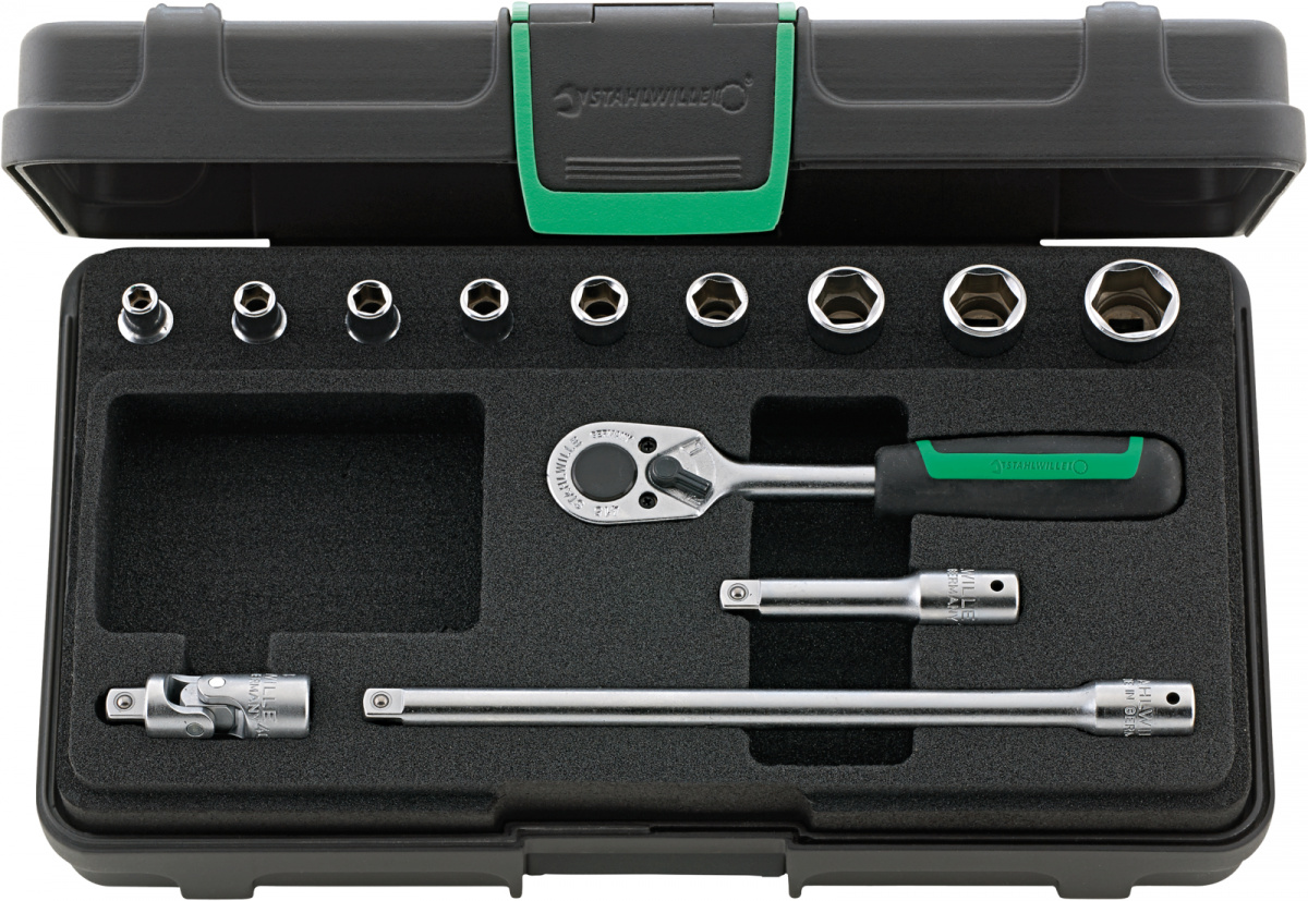 Sada nástrčných klíčů 1/4" [u v robustní, stohovatelném boxu z plastu ABS, 13-dílná Obsah: 9 kusů nástrčná hlavice se estihranným otvorem č. 40: rozměr klíča 4; 5; 5,5; 6; 7; 8; 10; 11; 13 mm 1 kus ráčňa č. 415 2 kusy predluovací díl č. 405/2 (54 mm) a č. 405/6 (150 mm) 1 kus kardanový kloub č. 407