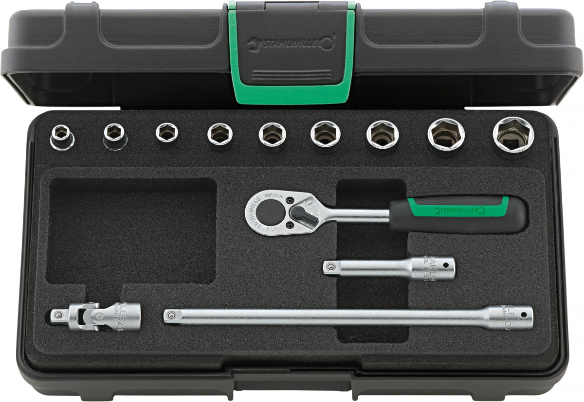 Sada nástrčných klíčů 1/4" [u v robustní, stohovatelném boxu z plastu ABS, 13-dílná Obsah: 9 ks nástrčná hlavice se estihranem č. 40a: rozměr klíče 3/16; 7/32; 1/4; 9/32; 5/16; 11/32; 3/8; 7/16; 1/2" 1 ks ráčňa č. 415 2 ks prodluovací díl č. 405/2 (54 mm), č. 405/6 (150 mm) 1 ks kardanový kloub č. 407