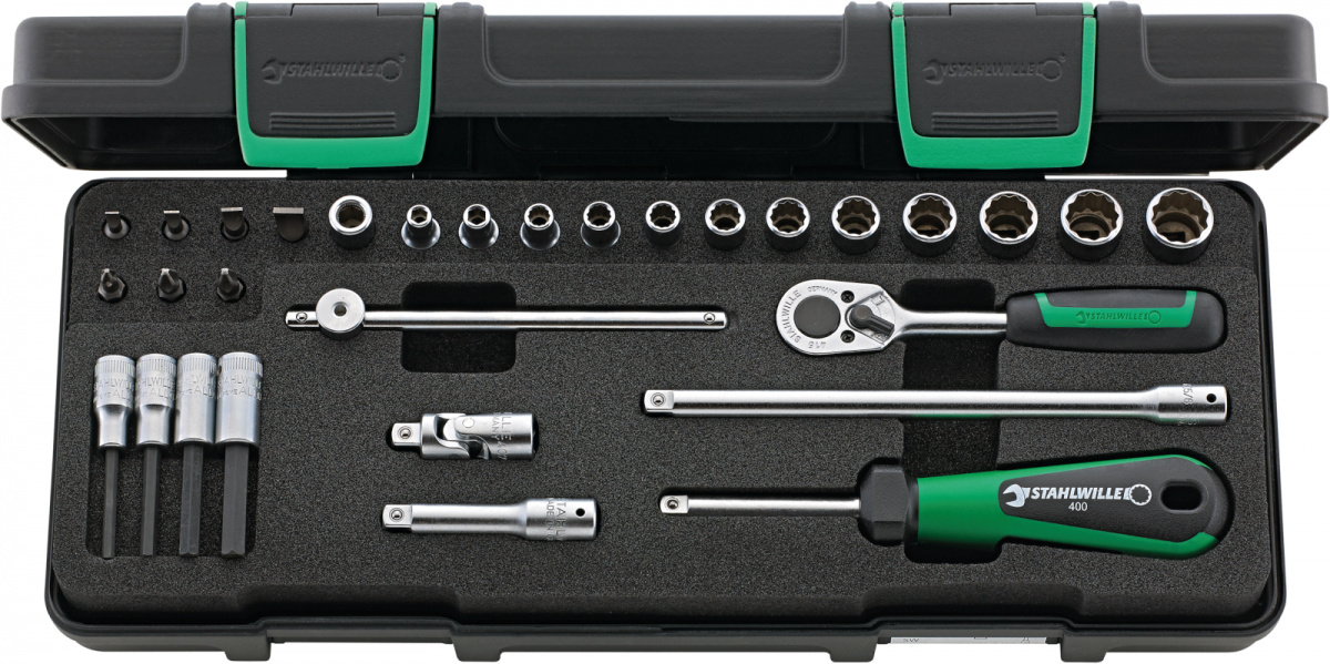 Sada nástrčných klíčů 1/4" [u v robustní, stohovatelném boxu z plastu ABS, 30-dílná Obsah: 2 kusů nástrčná hlavice se estihranným otvorem č. 40: rozměr klíče 4; 4,5 mm 10 kusů nástrčná hlavice s dvojitým estihranným otvorem č. 40D: rozměr klíče 5; 5,5; 6; 7; 8; 9; 10; 11; 12; 13 mm 4 kusy INHEX-hlavice č. 44: rozměr klíče 3; 4; 5; 6 mm 3 kzsy bit [k 1221: velikost 1; 1222: velikost 2; 1223: velíkost 3 4 kusy bit [r 1162: 0,6 x 3,5 mm; 1164: 0,8 x 4 mm; 1166: 1 x 5,5 mm; 1168: 1,6 x 8 mm1 ráčna č. 415 2 kusy prodluovací díl č. 405/2 (54 mm), a č. 405/6 (150 mm) 1 kus kardanový kloub č. 407 1 kus nástrčná rukoje č. 400 1 kus kříová rukoje č. 404 1 kus drák bitů č. 412