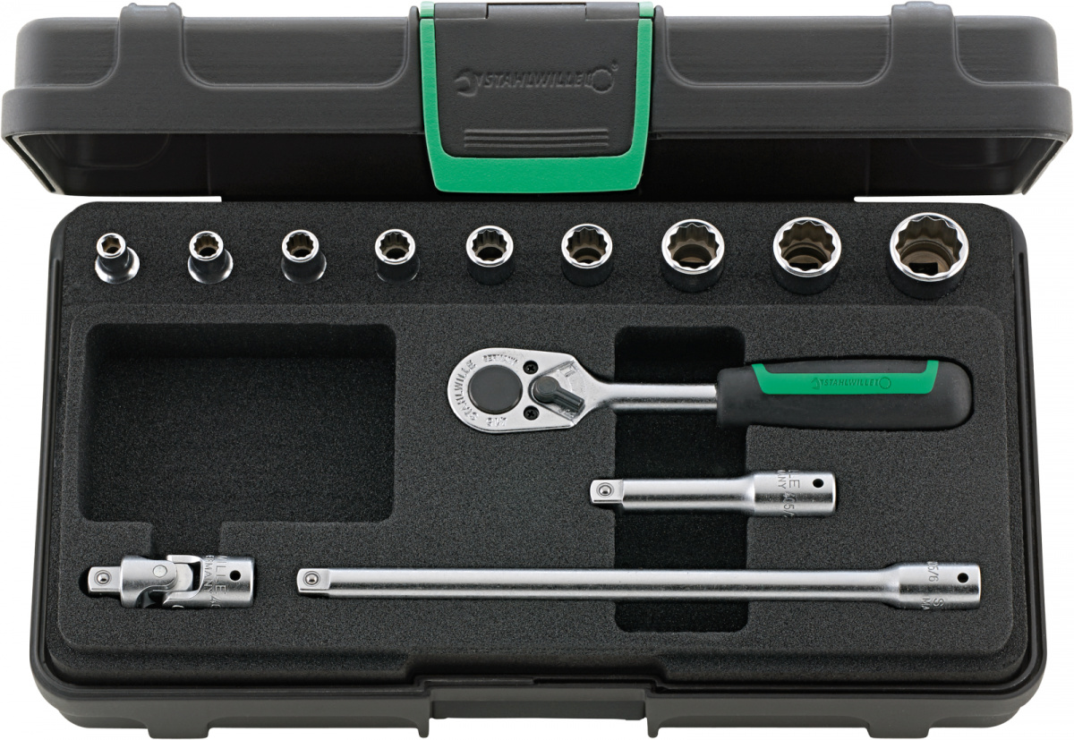 Sada nástrčných klíčů 1/4" [u v robustní, stohovatelném boxu z plastu ABS, 13-dílná Obsah: 9 kusůs hlavice nástrčného klíče s dvojitým estihranným otvorem č. 40D: rozměr klíče 4; 5; 5,5; 6; 7; 8; 10; 11; 13 mm 1 kus ráčňa č. 415 2 kusy prodluovací díly č. 405/2 (54 mm), a č. 405/6 (150 mm) 1 kus kloubový kardan č. 407