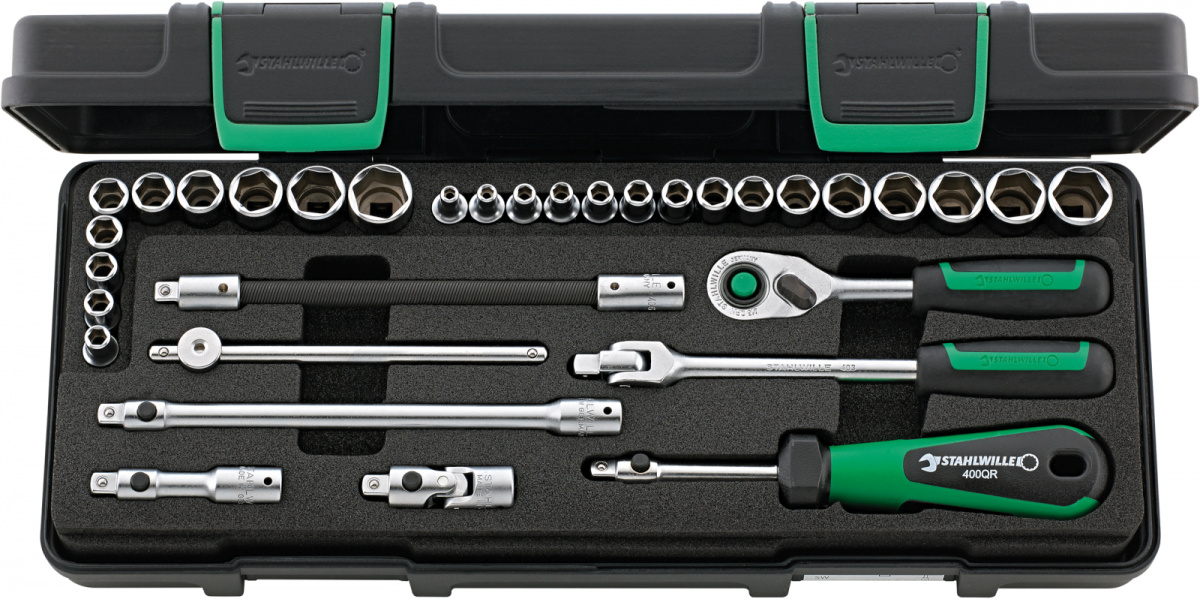 Sada nástrčných klíčů 1/4" [u v robustní, stohovatelném boxu z plastu ABS, 33-dílná Obsah: 25 ks nástrčná hlavice se estihranemč. 40: rozměr klíče 3,2; 3,5; 4; 4,5; 5; 5,5; 6; 7; 8; 9; 10; 11; 12; 13; 14 mm č. 40a: rozměr klíče 3/16; 7/32; 1/4; 9/32; 5/16; 11/32; 3/8; 7/16; 1/2; 9/16" 1 ks ráčňa č. 415QR N2 ks prodluovací díl č. 405QR/2 (54 mm), č. 405QR/6 (150 mm) 1 ks ohebný prodluovací díl č. 406 (152 mm) 1 ks kardanový kloub č. 407QR1 ks nástrčná rukoje č. 400QR1 ks kloubová rukoje č. 4031 ks kříová rukoje č. 404QR