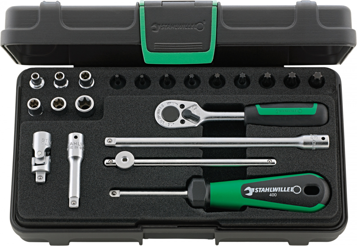 Sada TORX® 1/4" [u v robustní, stohovatelném boxu z plastu ABS, 21-dílná Obsah: 6 ks nástrčných klíčů pro roubky s vnějím TORX® č. 40TX: velikosti: E4; E5; E6; E7; E8; E10 9 ks nástrčných hlavic pro roubky s vnitřním TORX® č. 44KTX: velikosti T8; T9; T10; T15; T20; T25; T27; T30; T40 1 ks ráčňa č. 415 2 ks prodluovací díl č. 405/2 (54 mm), č. 405/6 (150 mm) 1 ks kardanový kloub č. 407 1 ks nástrčná rukoje č. 400 1 ks kříová rukoje č. 404