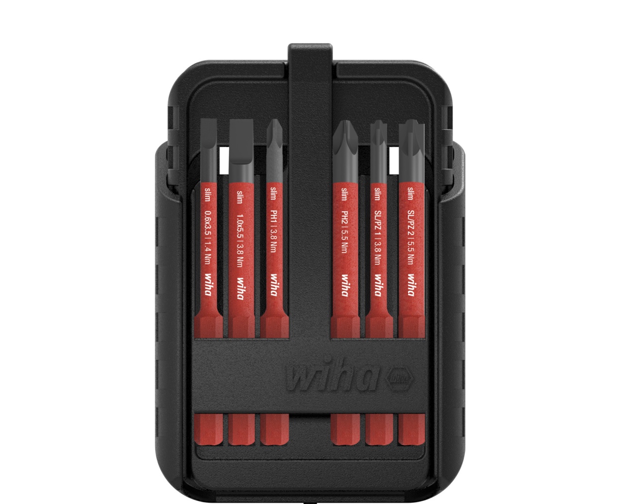 K dosažení hluboko položených šroubů je u obvyklých šroubováků pro elektrikáře průměr dříku často příliš velký. Odstranění izolace není však přístupné a navíc ohrožuje vlastní bezpečnost. U slimTECHNOLOGY Wiha, speciálně vyvinuté pro elektrikářské aplikace, byla do dříku integrována ochranná izolace k zeštíhlení dříků až o 33 %. Tak mohou být se slimBits bez námahy dosažitelné hluboko položené šroubové a pružinové prvky. Izolované slimBits jsou podrobeny kusové zkoušce podle mezinárodní normy IEC 60900 a umožňují bezpečnou práci v oblasti dílů pod napětím do 1 000 V AC. SlimBits jsou uloženy ve dvou vzájemně kombinovaných boxech na nástavce, které umožňují optimální pohled na profily šroubů. Díky přiloženému klipsu na opasek jsou boxy slimBit perfektním průvodcem při mobilním nasazení.