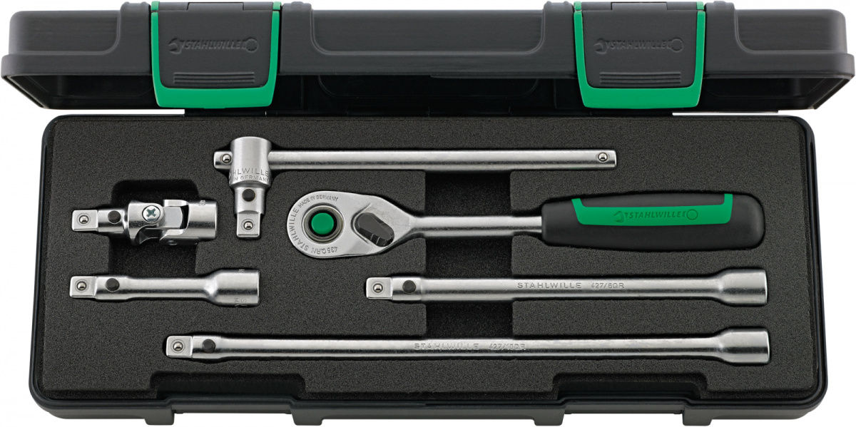 Satz Betätigungswerkzeuge in sturdy, stackable ABS plastic case,6 piecesContent:1 ratchet nr. 435QR N3 extensions nr. 427QR/3 (76 mm), nr. 427QR/6 (160 mm), nr. 427QR/10 (240 mm)1 universal joint nr. 428QR1 T-handle nr. 425QR