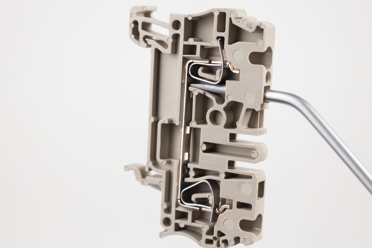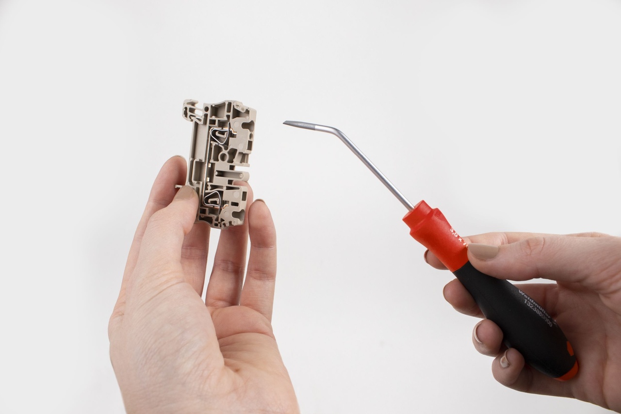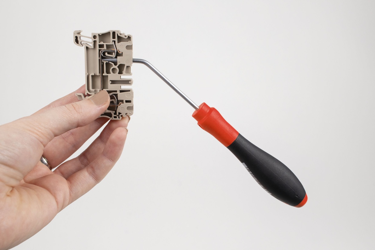 Ve stísněných prostorových podmínkách, například v rozvodné skříni, představuje obsluha pružinových svorek zvlášť tvrdý oříšek. Šroubováky brání pohledu na svorku a ztěžují práci, protože jednou rukou musíte držet šroubovák a druhou zavádět vodič. Nástroj k ovládání pružin s čepelí ohnutou o 40° zlepšuje přístupnost díky nerušenému pohledu na svorku. Čepel navíc po zasunutí zůstává ve svorce, takže můžete obě ruce využít k připojení kabelu. Ovládací nástroj s designem rukojeti SoftFinish® se vyznačuje optimální schopností záběru, díky níž je šetrný vůči rukám a svalům. Odolná kovová čepel je zárukou dlouhé životnosti i při intenzivním používání.