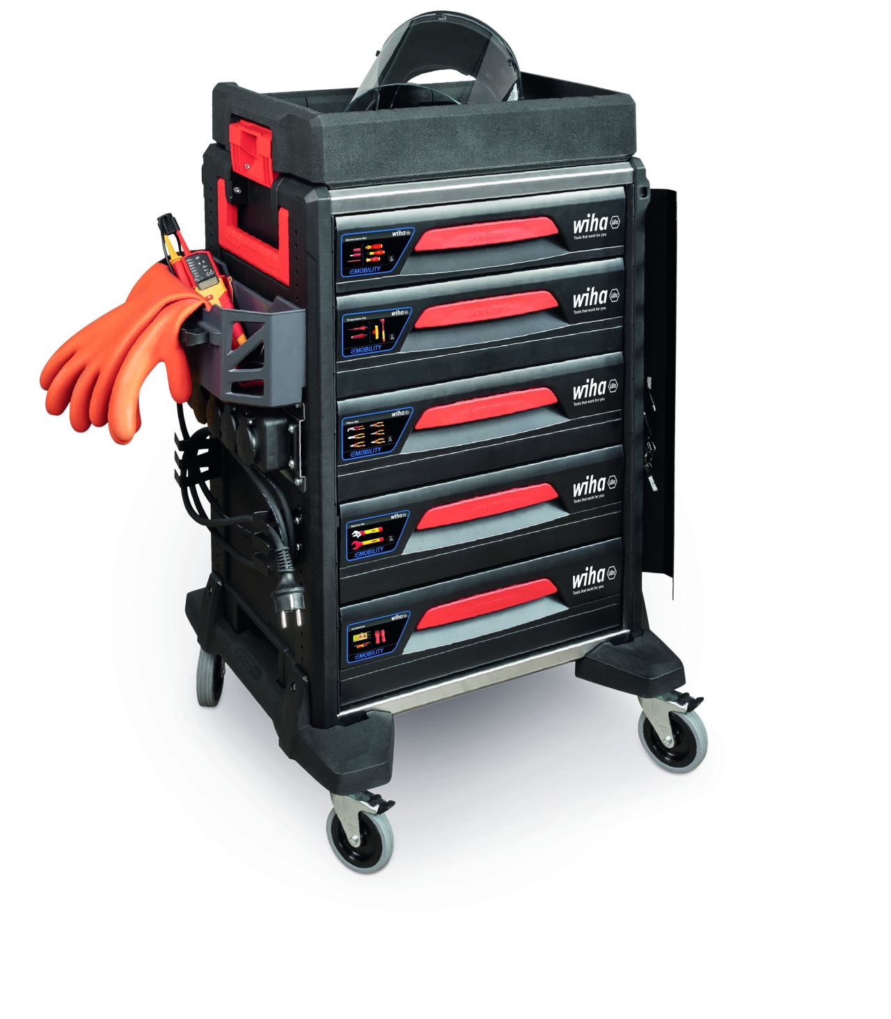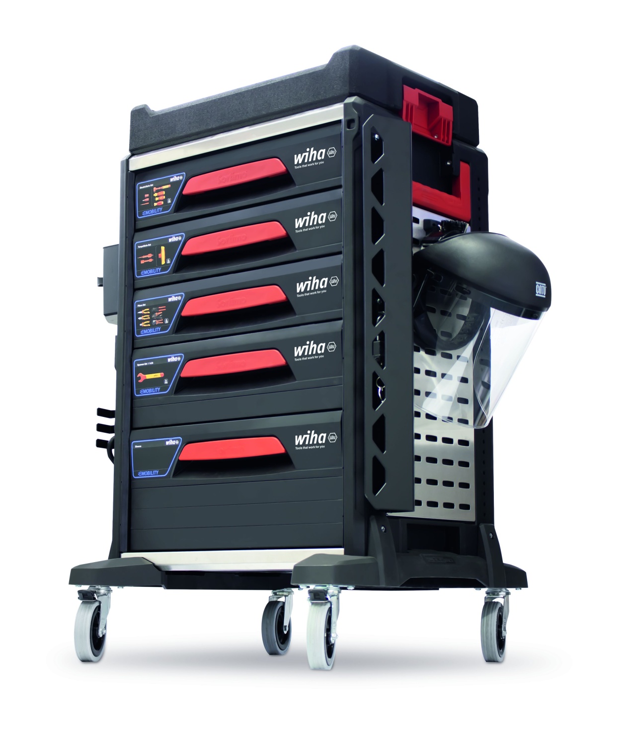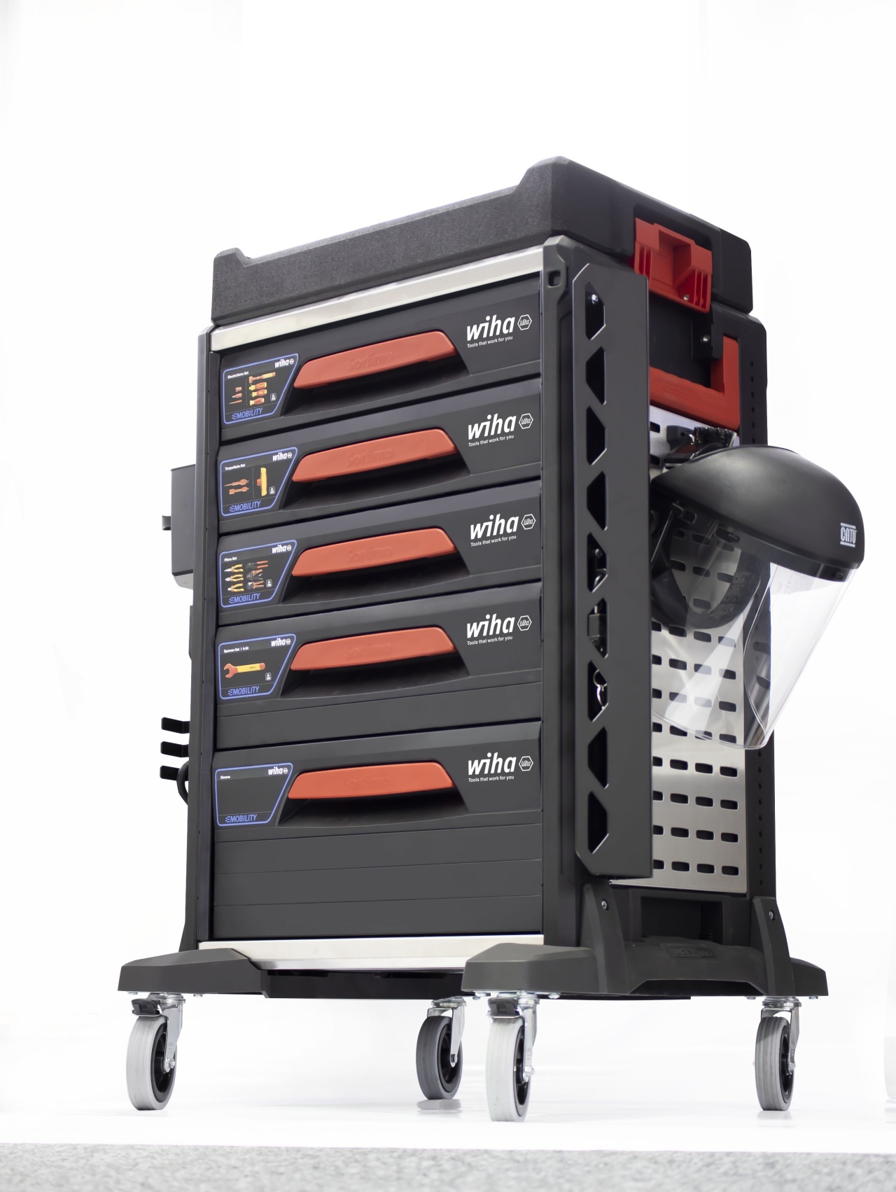 Práce na automobilech s elektrickým pohonem vyžadují zvláštní kvalifikaci pracovníků a také bezpečné a certifikované vybavení. S dílenským vozíkem se sadou nářadí eMobility má uživatel k dispozici veškeré potřebné nástroje k montáži a opravě hybridních automobilů a elektromobilů vždy na správném místě.. V dílenském vozíku vybaveném bohatou a kompaktně uloženou paletou kvalitního nářadí najdete při práci vždy správné nástroje, které právě potřebujete. Velká část ručního nářadí je opatřena izolací certifikovanou organizací VDE, která zaručuje bezpečnou práci na dílech pod napětím. Nářadí je bezpečně a přehledně uloženo v dokonale tvarovaných pěnových vložkách v pěti zásuvkách. Zásuvky s nářadím lze kompletně vysunout. Díky tomu k němu vždy máte snadný a rychlý přístup. Doplňkový úložný prostor a čtyři integrované elektrické zásuvky umožňují vozík individuálně rozšiřovat – i o elektrické přístroje. Další předností dílenského vozíku je mobilita, kterou garantují ližiny s kolečky dovolující po dílně pohodlně přepravovat až 150 kg nářadí. Brzdy na kolečkách zaručují dokonalou stabilitu. Dílenský vozík tak lze flexibilně přemisťovat a zároveň ho používat jako stabilní pracovní stůl či odkládací prostor. S kompletně osazeným dílenským vozíkem máte vždy po ruce to správné nářadí Wiha – od zkoušečky napětí přes momentový klíč a ochranné rukavice až po výstražné štítky.