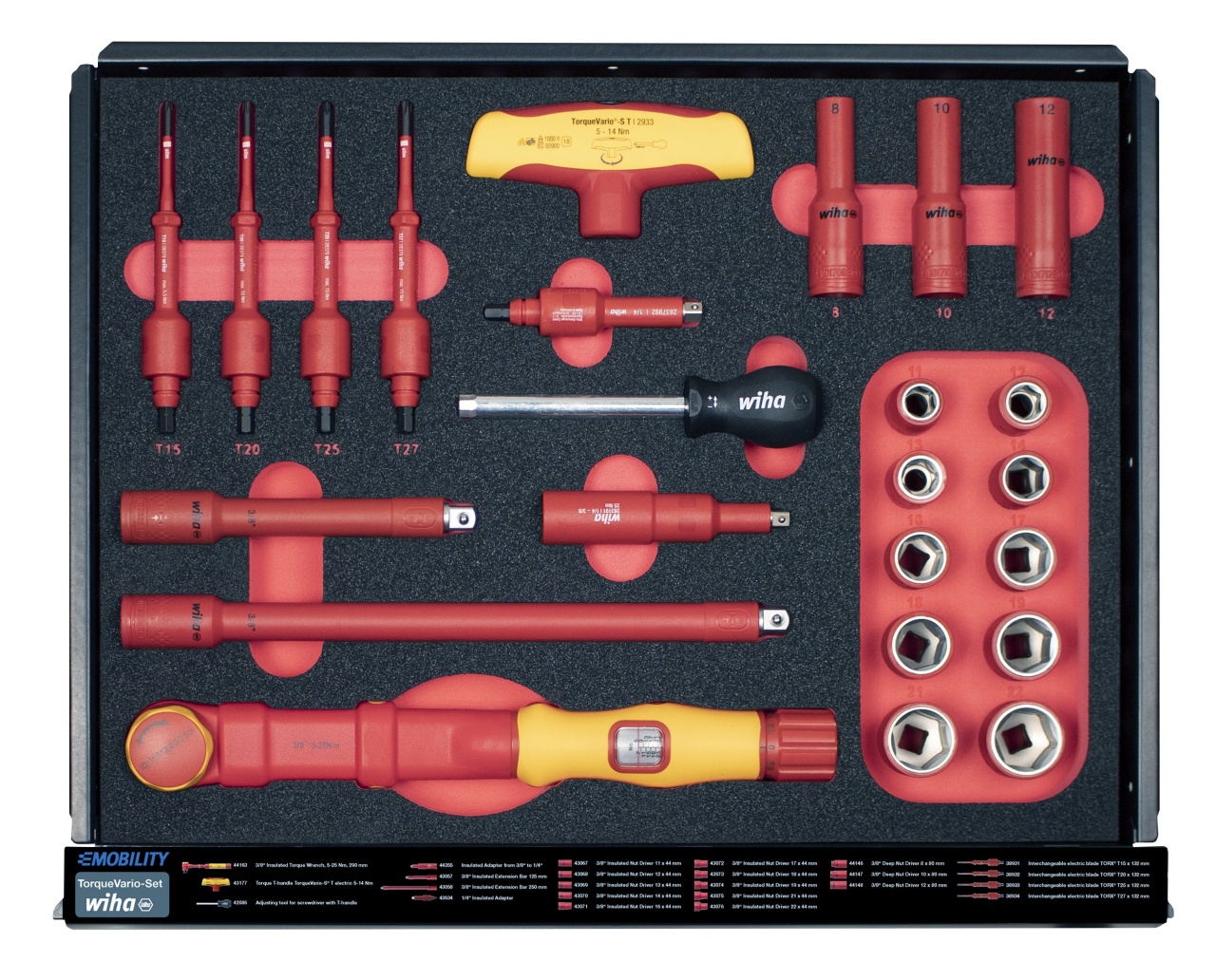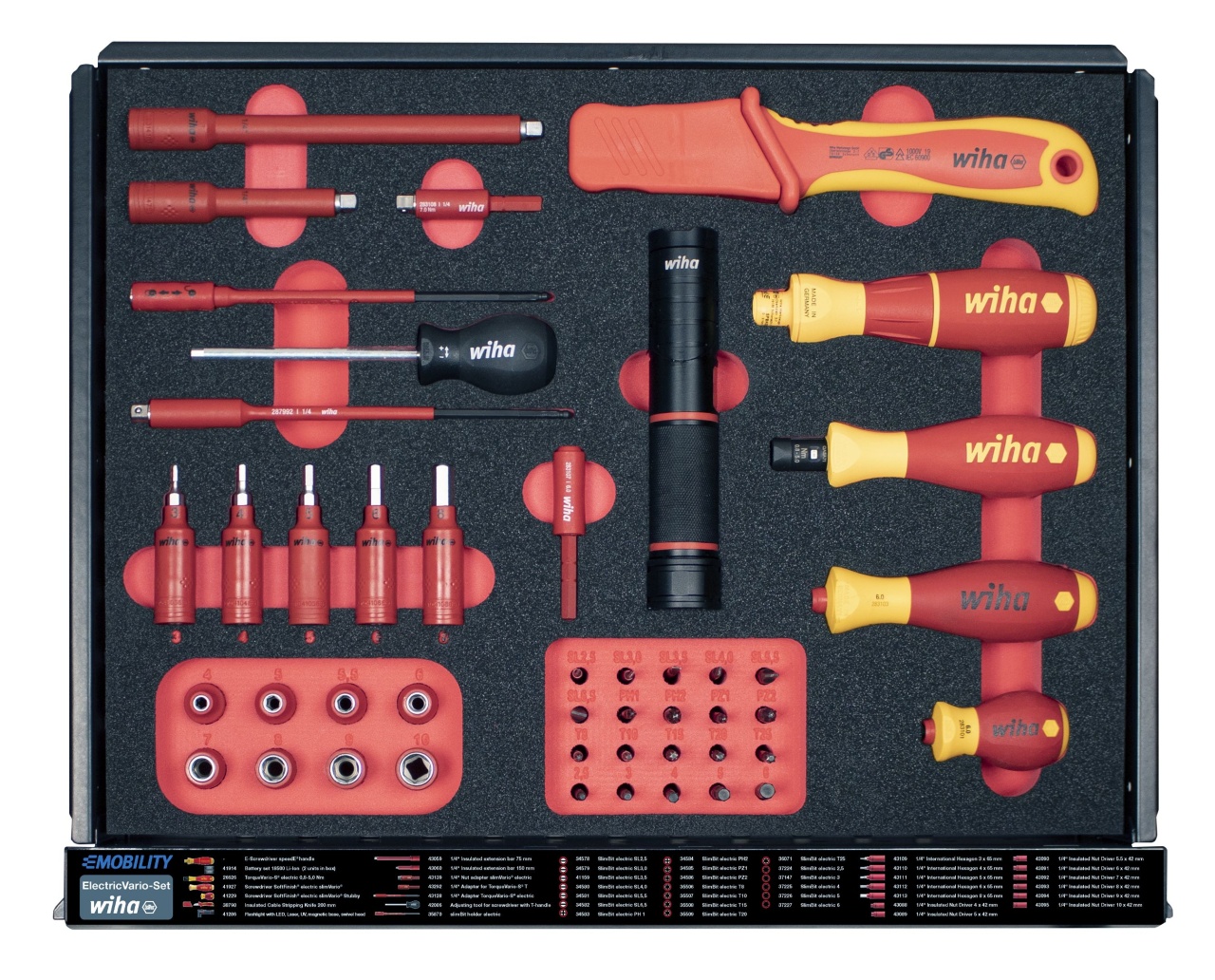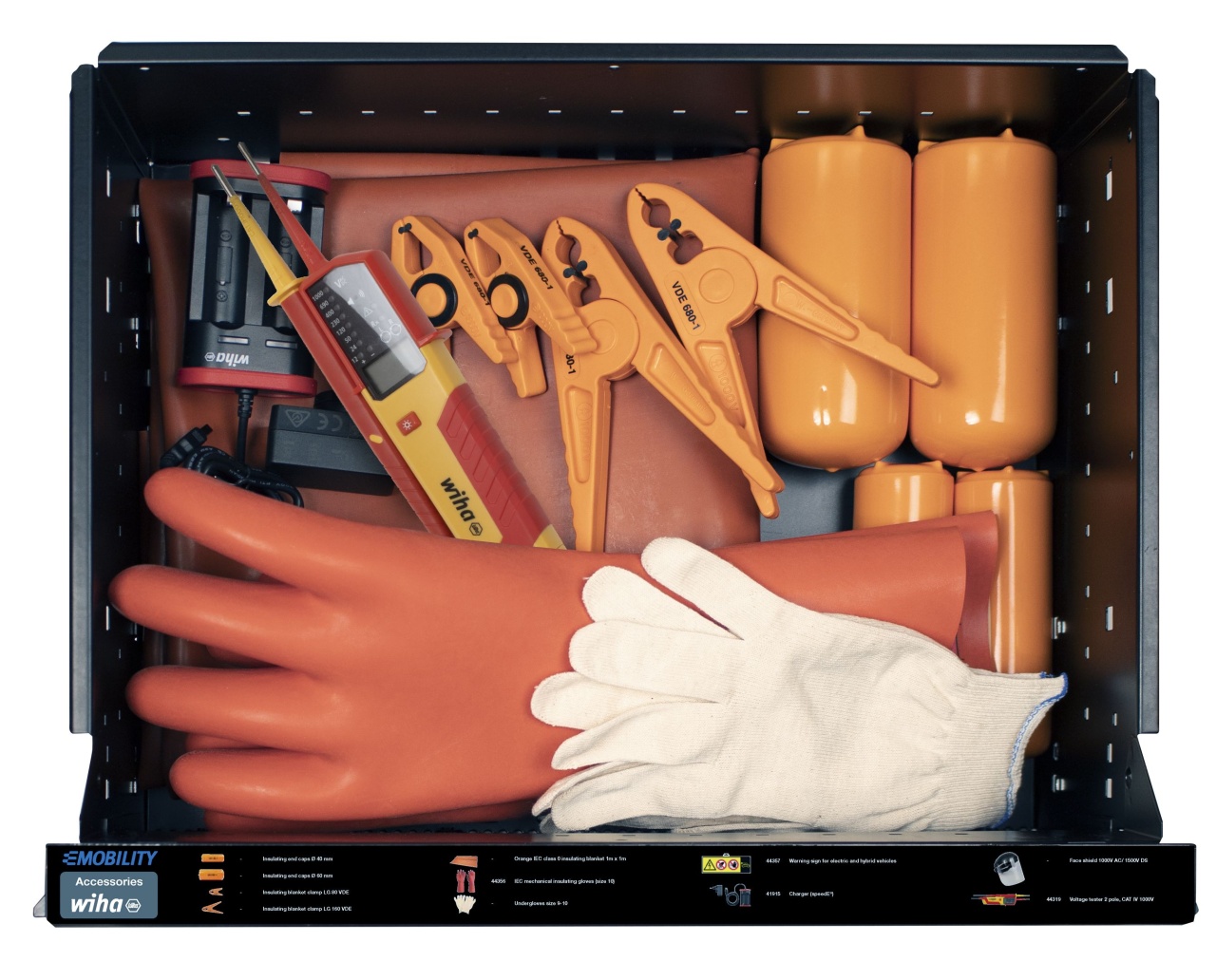 Práce na automobilech s elektrickým pohonem vyžadují zvláštní kvalifikaci pracovníků a také bezpečné a certifikované vybavení. S dílenským vozíkem se sadou nářadí eMobility má uživatel k dispozici veškeré potřebné nástroje k montáži a opravě hybridních automobilů a elektromobilů vždy na správném místě.. V dílenském vozíku vybaveném bohatou a kompaktně uloženou paletou kvalitního nářadí najdete při práci vždy správné nástroje, které právě potřebujete. Velká část ručního nářadí je opatřena izolací certifikovanou organizací VDE, která zaručuje bezpečnou práci na dílech pod napětím. Nářadí je bezpečně a přehledně uloženo v dokonale tvarovaných pěnových vložkách v pěti zásuvkách. Zásuvky s nářadím lze kompletně vysunout. Díky tomu k němu vždy máte snadný a rychlý přístup. Doplňkový úložný prostor a čtyři integrované elektrické zásuvky umožňují vozík individuálně rozšiřovat – i o elektrické přístroje. Další předností dílenského vozíku je mobilita, kterou garantují ližiny s kolečky dovolující po dílně pohodlně přepravovat až 150 kg nářadí. Brzdy na kolečkách zaručují dokonalou stabilitu. Dílenský vozík tak lze flexibilně přemisťovat a zároveň ho používat jako stabilní pracovní stůl či odkládací prostor. S kompletně osazeným dílenským vozíkem máte vždy po ruce to správné nářadí Wiha – od zkoušečky napětí přes momentový klíč a ochranné rukavice až po výstražné štítky.
