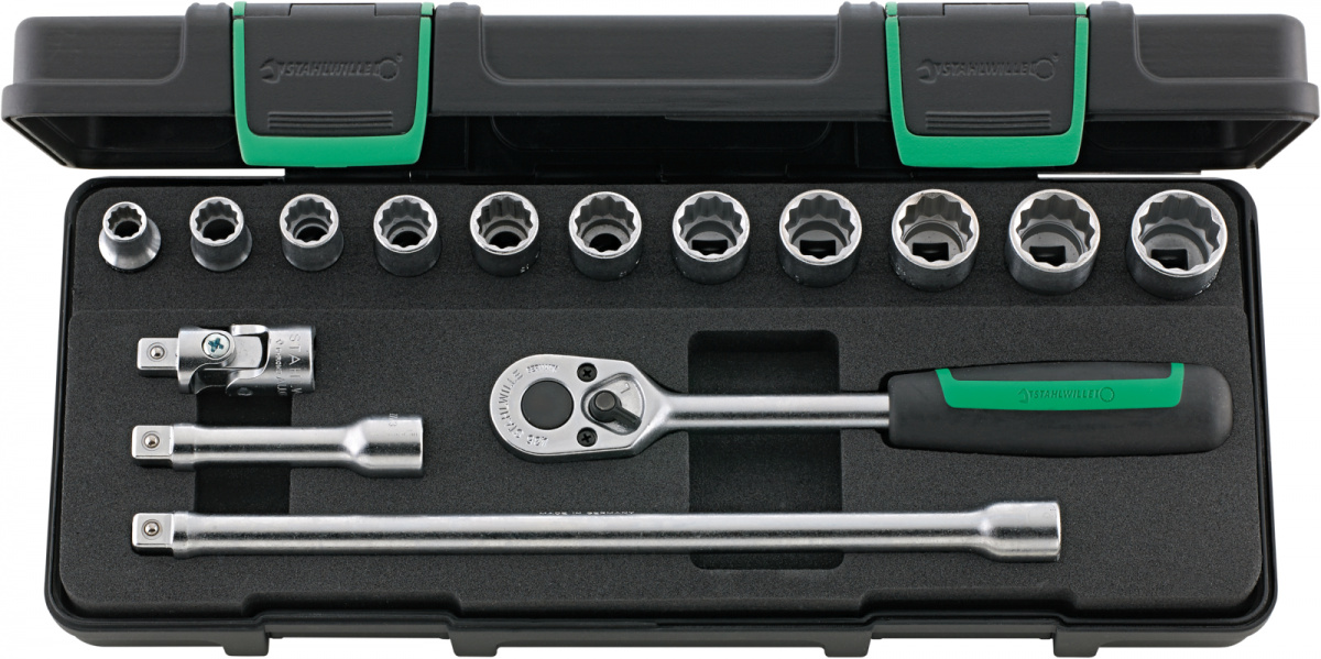 Sada nástrčných klíčů 3/8" [u v robustní, stohovatelném boxu z plastu ABS, 15-dílná Obsah: 11 hlavic nástrčných klíčů s dvojitým estihranem č. 45: rozměr klíče 8; 10; 11; 12; 13; 14; 15; 16; 17; 18; 19 mm 1 ks ráčna č. 435 2 ks prodluovací díl kus č. 427/3 (76 mm) a č. 427/10 (240 mm) 1 ks kardanový kloub č. 428