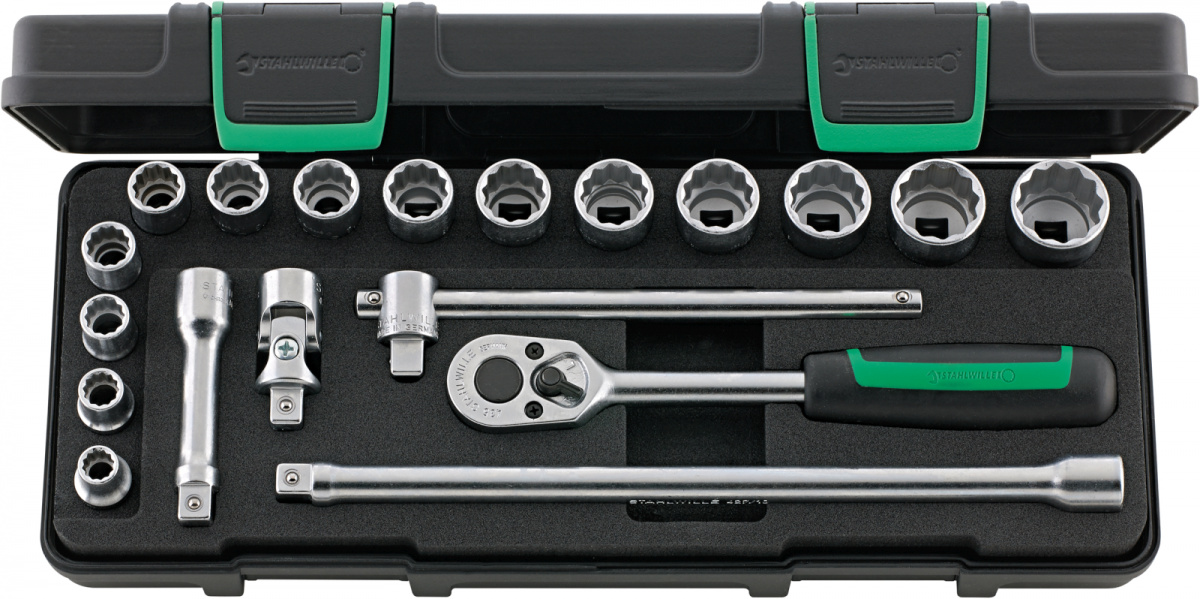 Sada nástrčných klíčů 3/8" [u v robustní, stohovatelném boxu z plastu ABS, 19-dílná Obsah: 14 nástrčných hlavic s dvojitým estihranem č. 45: rozměr klíče 8; 9;10; 11; 12; 13; 14; 15; 16; 17; 18; 19; 21 mm 1 ks ráčňa č. 435 2 ks prodluovací díl č. 427/3 (76 mm) a č. 427/10 (240 mm) 1 ks kříová rukoje č. 425 1 ks kardanový kloub č. 428