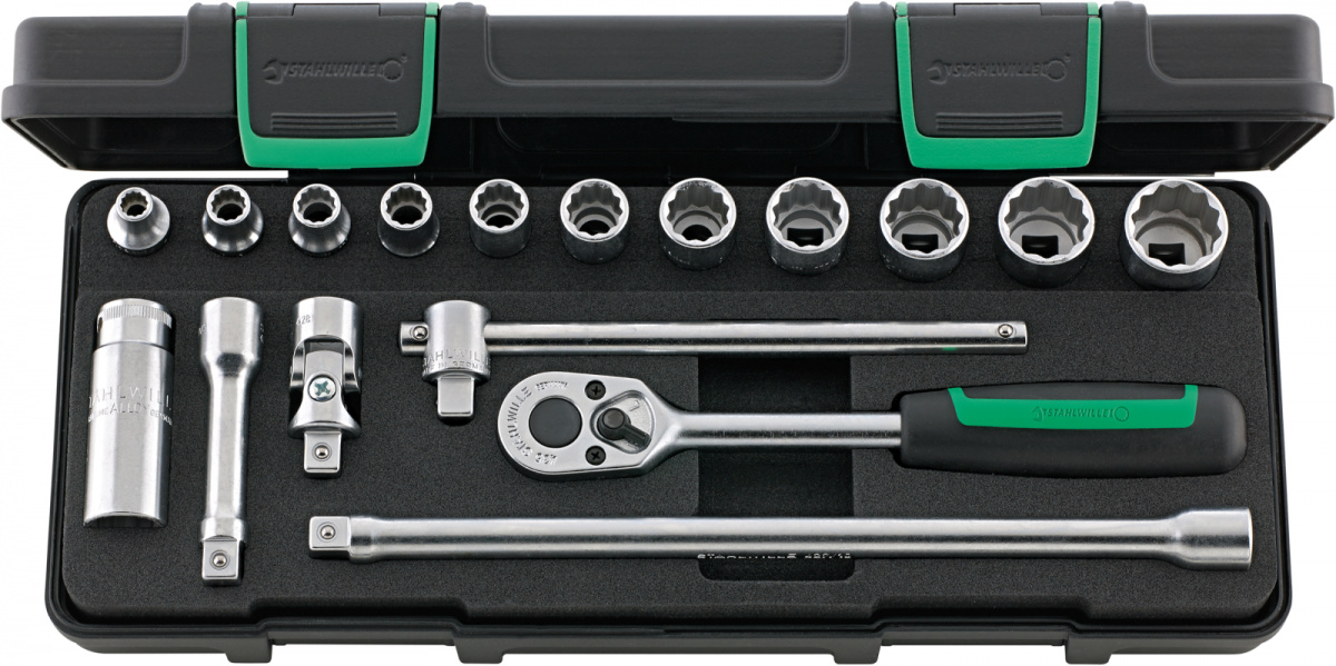 Sada nástrčných klíčů 3/8" [u v robustní, stohovatelném boxu z plastu ABS, 17dílná Obsah: 11 nástrčných hlavic s dvojitým estihranem č. 45a: rozměr klíče 1/4; 5/16; 11/32; 3/8; 7/16; 1/2; 9/16; 5/8; 11/16; 3/4; 13/16" 1 ks nástrčných hlavic s dvojitým estihranem, s gumovou vlokou č. 4600: rozměr klíče 16 mm - 5/8" 1 ks ráčna č. 435 2 ks prodluovací díl č. 427/3 (76 mm) a č. 427/10 (240 mm) 1 ks kříová rukoje č. 425 1 ks kardanový kloub č. 428