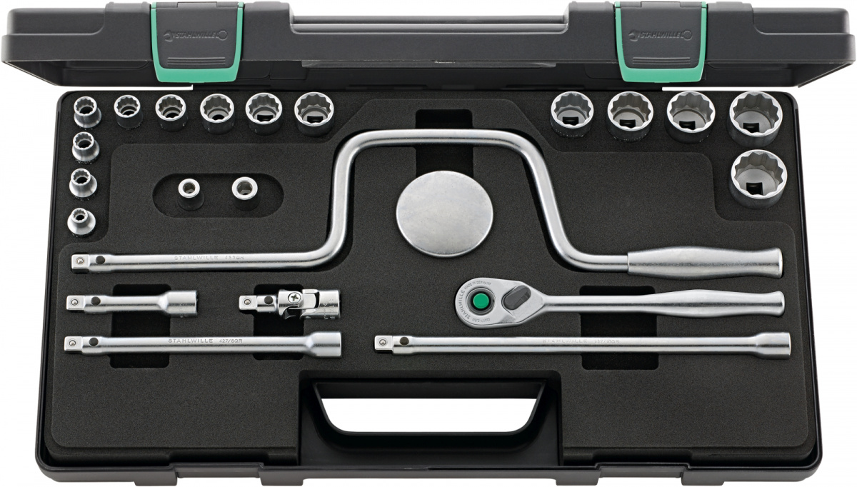 Sada nástrčných klíčů 3/8" [u v robustní, stohovatelném boxu z plastu ABS, 22-dílná Obsah: 14 nástrčných hlavic s dvojitým estihranem č. 45a: rozměr klíče 1/4; 5/16; 11/32; 3/8; 7/16; 1/2; 9/16; 5/8; 11/16; 3/4; 13/16; 7/8; 15/16; 1" 1 ks ráčna č. 435SG-QR 3 ks prodluovací díl č. 427/3QR (76 mm), 427/6QR (160 mm) a č. 427/10QR (240 mm) 1 ks kardanový kloub č. 428QR 2 ks drák bitů č. 442, č. 443 1 ks klika č. 453