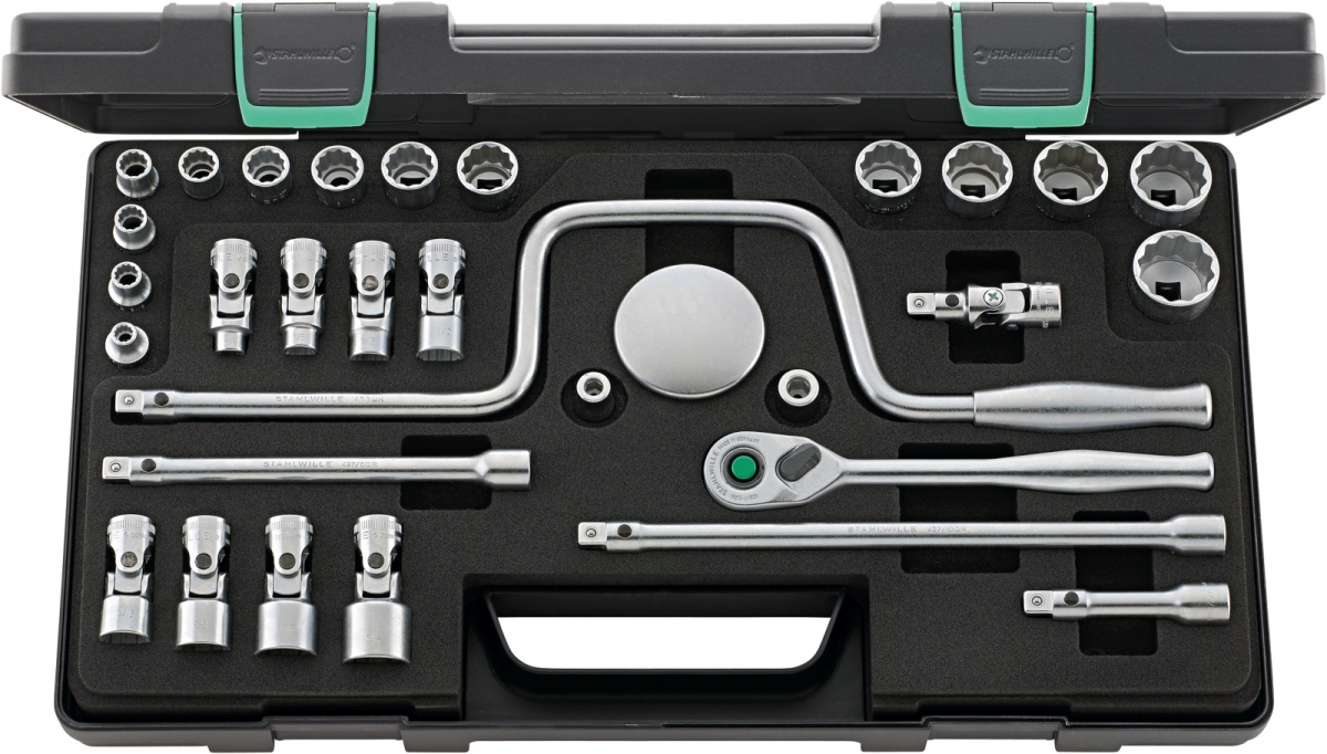 Sada nástrčných klíčů 3/8" [u v robustní, stohovatelném boxu z plastu ABS, 30-dílná Obsah: 14 nástrčných hlavic s dvojitým estihranem č. 45a: rozměr klíče 1/4; 5/16; 11/32; 3/8; 7/16; 1/2; 9/16; 5/8; 11/16; 3/4; 13/16; 7/8; 15/16; 1" 8 ks kloubová hlavice nástrčná s dvojitým estihranem č. 47a: rozměr klíče 5/16; 3/8; 7/16; 1/2; 9/16; 5/8; 11/16; 3/4" 1 ks ráčna č. 435SG-QR 3 ks prodluovací díl č. 427/3QR (76 mm), 427/6QR (160 mm) a č. 427/10QR (240 mm) 1 ks kardanový kloub č. 428QR 2 ks drák bitů č. 422 a č. 443 1 ks klika č. 453