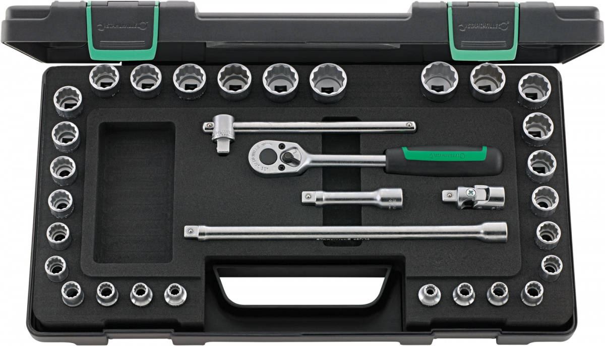 Sada nástrčných klíčů 3/8" [u v robustní, stohovatelném boxu z plastu ABS, 33-dílná Obsah: 28 nástrčných hlavic s dvojitým estihranem č. 45: rozměr klíče 7; 8; 9; 10; 11; 12; 13; 14; 15; 16; 17; 18; 19 ; 21; 22 mm č. 45a: rozměr klíče 1/4; 5/16; 11/32; 3/8; 7/16; 5/8; 11/16; 3/4; 13/16; 7/8" 1 ks ráčna č. 435 2 ks prodluovací díl č. 427/3 (76 mm) a č. 427/10 (240 mm) 1 ks kříová rukoje č. 425 1 ks kardanový kloub č. 428