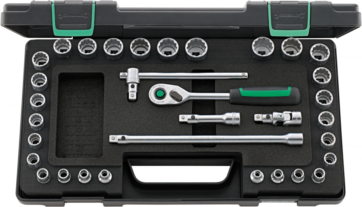 Sada nástrčných klíčů 3/8" [u v robustní, stohovatelném boxu z plastu ABS, 33-dílná Obsah: 28 nástrčných hlavic s dvojitým estihranem č. 45: rozměr klíče 7; 8; 9; 10; 11; 12; 13; 14; 15; 16; 17; 18; 19 ; 21; 22 mm č. 45a: rozměr klíče 1/4; 5/16; 11/32; 3/8; 7/16; 5/8; 11/16; 3/4; 13/16; 7/8" 1 ks ráčna č. 435QR N 2 ks prodluovací díl č. 427QR/3 (76 mm) a č. 427QR/10 (240 mm) 1 ks kříová rukoje č. 425QR1 ks kardanový kloub č. 428QR