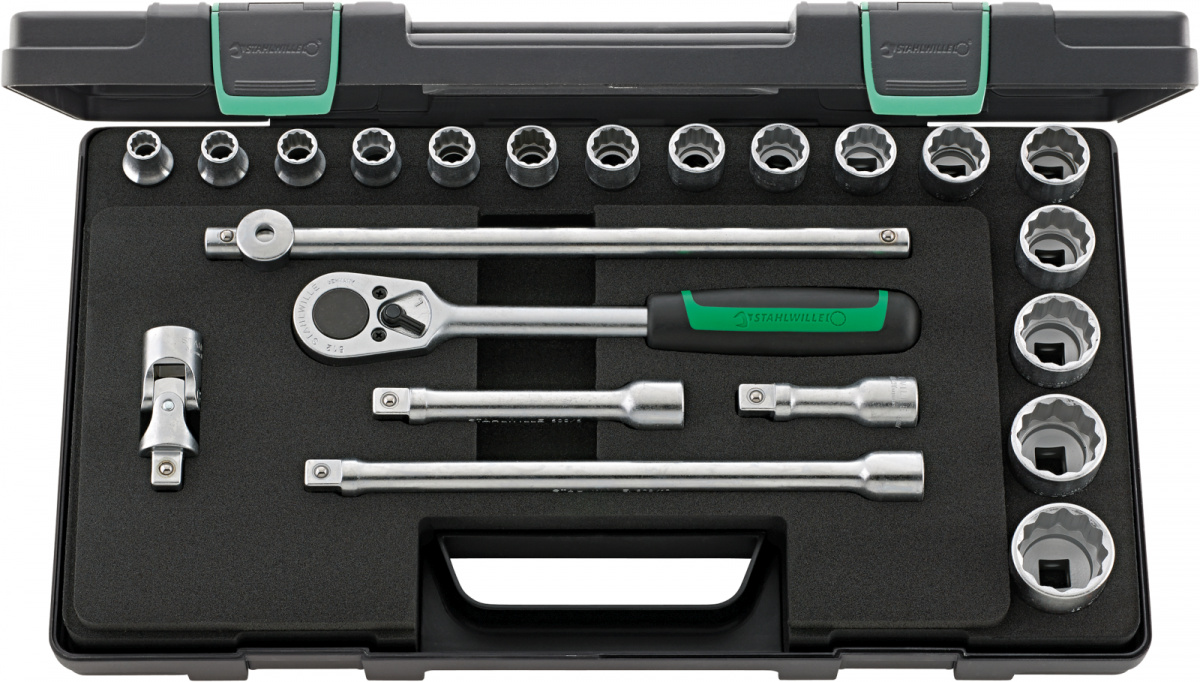 Sada nástrčných klíčů 1/2" [u v pevné oceloplechové skříňce, 22-dílná Obsah: 16 ks nástrčná hlavice s dvojitým estihranem č. 50: rozměr klíče 10; 11; 12; 13; 14; 15; 16; 17; 18; 19; 21; 22; 24; 27; 30; 32 mm 1 ks ráčna č. 512 3 ks prodluovací díl č. 509/3 (75 mm), č. 509/5 (130 mm), č. 509/10 (255 mm) 1 ks kříová rukoje č. 506 1 ks kardanový kloub č. 510