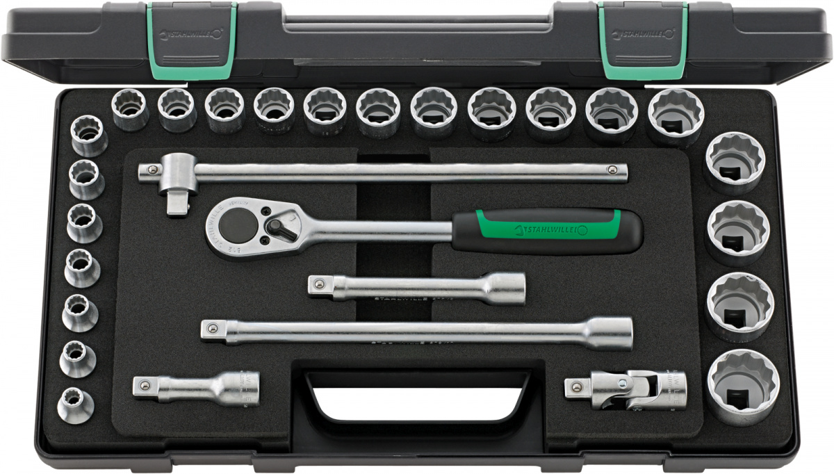 Sada nástrčných klíčů 1/2" [u v pevné oceloplechové skříňce, 28-dílná Obsah: 22 ks nástrčná hlavice s dvojitým estihranem č. 50: rozměr klíče 8; 10; 11; 12; 13; 14; 15; 16; 17; 18; 19; 21; 22; 24; 27; 30; 32 mm 1 ks ráčna č. 512 3 ks prodluovací díl č. 509/3 (75 mm), č. 509/5 (130 mm), č.509/10 (255 mm) 1 ks kříová rukoje č. 506 1 ks kardanový kloub č. 510