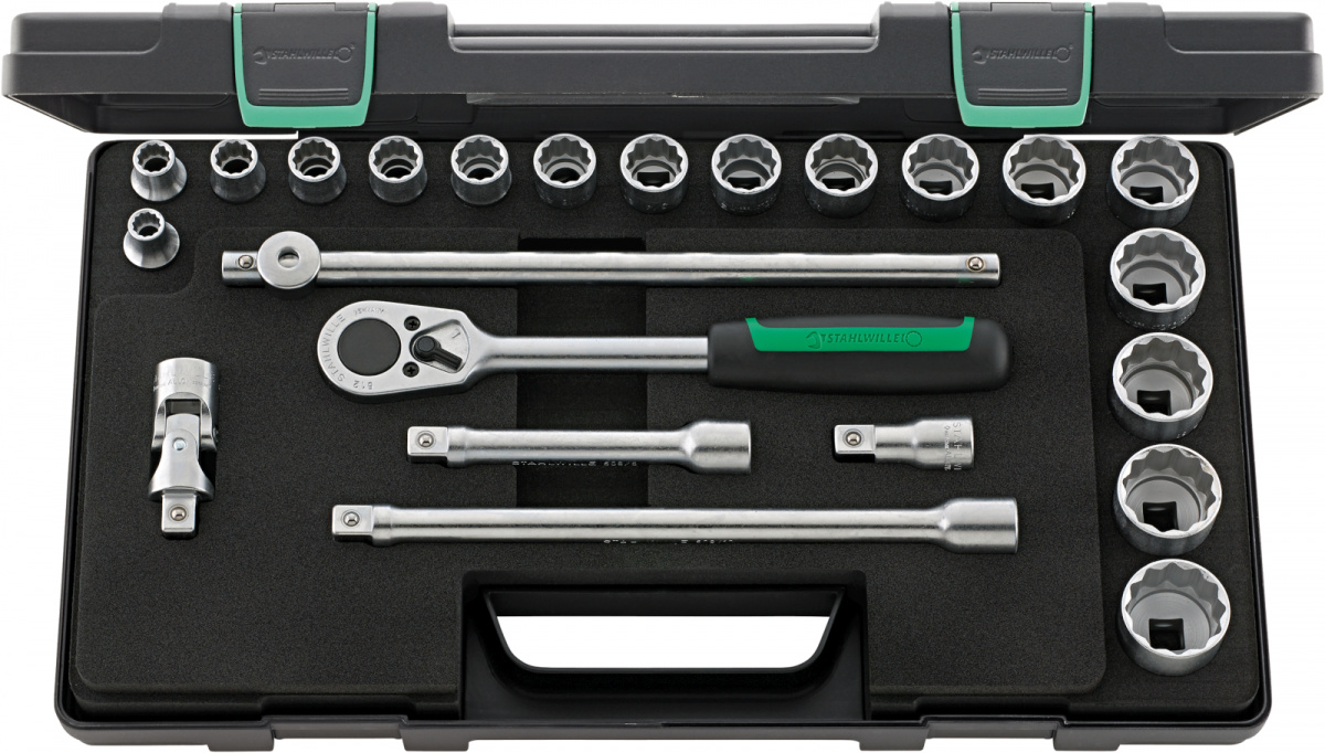 Sada nástrčných klíčů 1/2" [u v pevné oceloplechové skříňce, 23-dílná Obsah: 17 ks nástrčná hlavice s dvojitým estihranem č. 50a: rozměr klíče 3/8; 7/16; 1/2; 9/16; 19/32; 5/8; 11/16; 3/4; 13/16; 7/8; 15/16; 1; 1 1/16; 1 1/8; 1 3/16; 1 1/4" 1 ks ráčna č. 512 3 ks prodluovací díl č. 509/2 (52 mm); 509/5 (130 mm), č. 509/10 (255 mm) 1 ks kříová rukoje č. 506 1 ks kardanový kloub č. 510