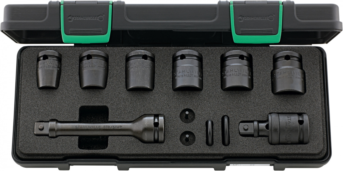 IMPACT-sada 8-dílná Obsah: 6 ks nástrčná hlavice č. 50IMP: rozměr klíče 13; 17; 19; 21; 22; 24 mm 1 ks prodluovací kus č. 509/5IMP 1 ks kardanový kloub č. 510IMP.