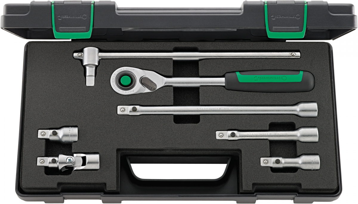 Set of wrenches in sturdy, stackable ABS plastic case,7 pieces Content :1 ratchet No 512QR N4 extension No 509QR/2 (52 mm), No 509QR/3 (75 mm), No 509QR/5 (130 mm), No 509QR/10 (255 mm)1 universal joint No 510QR1 T-handle No 506QR