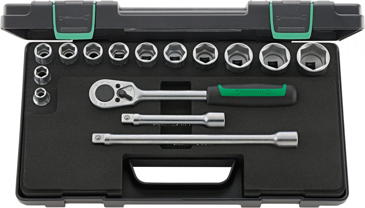 Sada nástrčných klíčů 1/2" [u v robustní, stohovatelném boxu z plastu ABS, 15-dílná Obsah: 12 ks nástrčná hlavice se estihranem č. 52: rozměr klíče 10; 13; 16; 17; 18; 19; 21; 22; 24; 27; 30; 32 mm 1 ks ráčna č. 512 2 ks prodluovací díl č. 509/5 (130 mm), č. 509/10 (255 mm)
