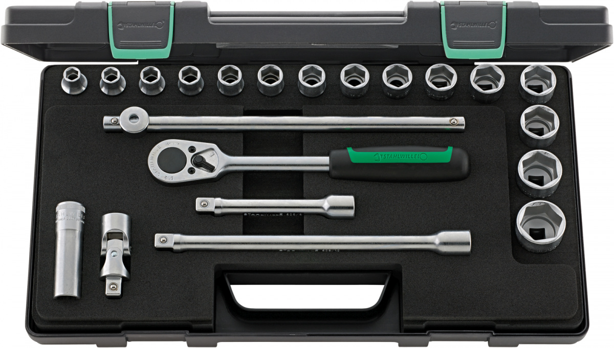Sada nástrčných klíčů 1/2" [u v pevné oceloplechové skříňce, 21-dílná Obsah: 15 nástrčná hlavice se estihranem č. 52: rozměr klíče 10; 11; 12; 13; 14; 15; 16; 17; 18; 19; 21; 22; 24; 27; 30 mm 1 ks nástrčná hlavice, prodlouená, s gumovou vlokou, č. 51: rozměr klíče 16 mm - 5/8" 1 ks ráčna č. 512 2 ks prodluovací díl č. 509/5 (130 mm), č. 509/10 (255 mm) 1 ks kříová rukoje č. 506 1 ks kardanový kloub č. 510