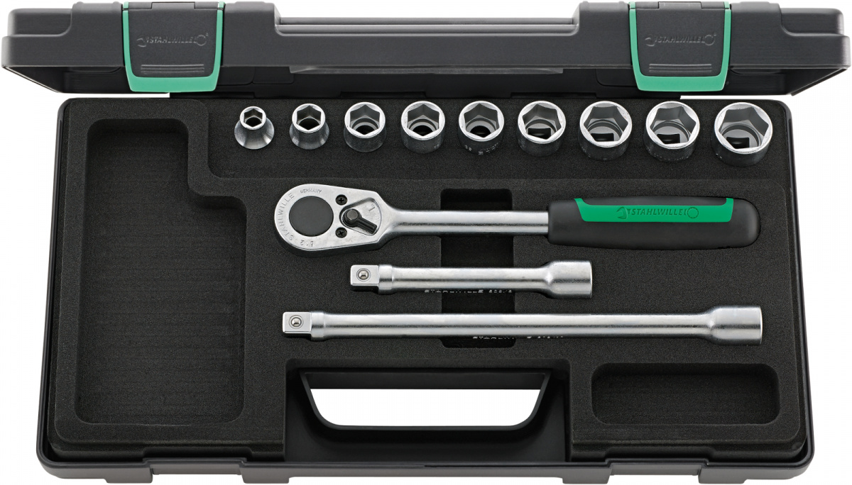 Sada nástrčných klíčů 1/2" [u v robustní, stohovatelném boxu z plastu ABS, 12-dílná Obsah: 9 ks nástrčná hlavice se estihranem č. 52: rozměr klíče 10; 13; 16; 17; 18; 19; 21; 22; 24 mm 1 ks ráčna č. 512 2 ks prodluovací díl č. 509/5 (130 mm), č. 509/10 (255 mm)
