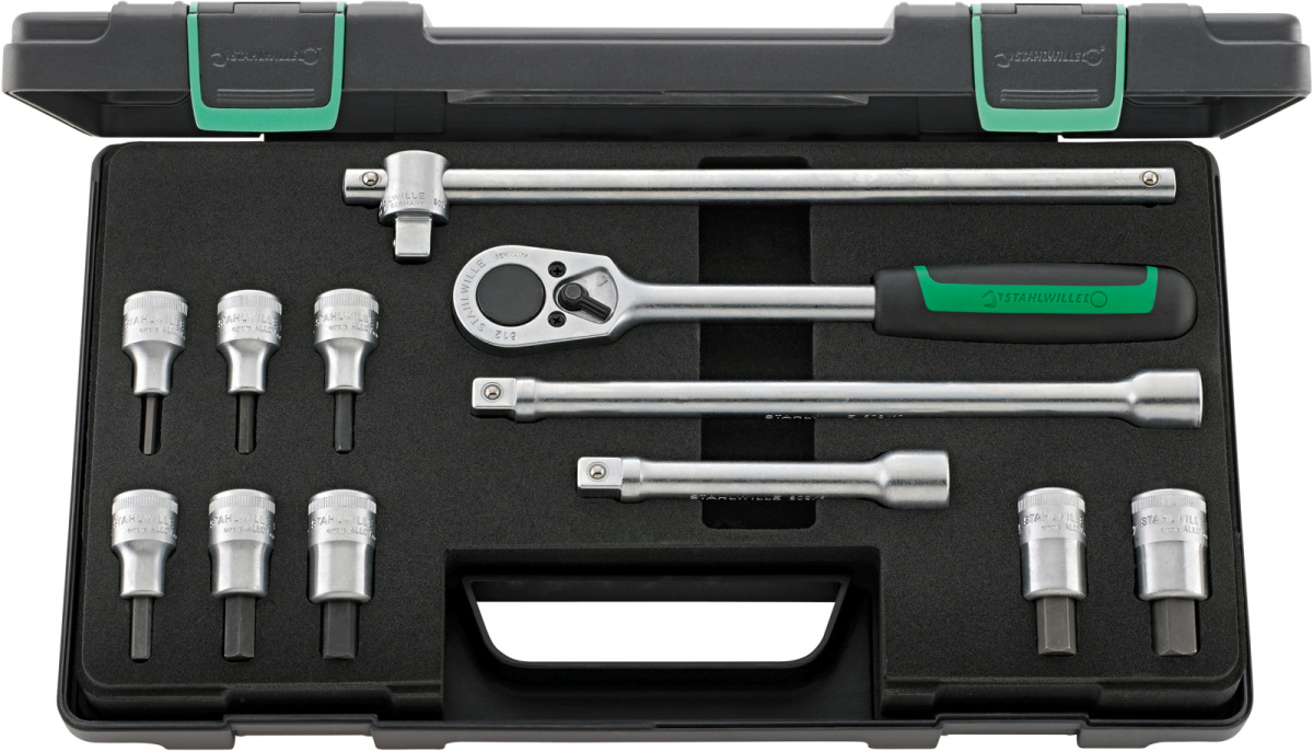 Sada nástrčných klíčů 1/2" [u v pevné oceloplechové skříňce, 12-dílná Obsah: 8 ks INHEX-hlavice č. 54: rozměr klíče 4; 5; 6; 8; 10; 12; 14; 17 mm 1 ks ráčna č. No 512 2 ks prodluovací díl č. 509/5 (130 mm), č. 509/10 (255 mm) 1 ks kříová rukoje č. 506