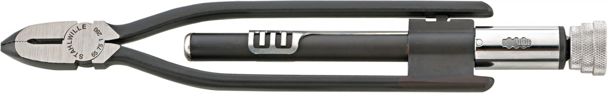 Kletě k zaplétání drátů k zajiování roubů, s doplñkovou řezací hranou, s fazetovanými čelistmi, s 40° úkosem, na dráty do průměru 1,6 mm (dec.in. 0,06), se směrem otáčení doprava a doleva, s automatickým návratem; chrom-vanadová ocel.