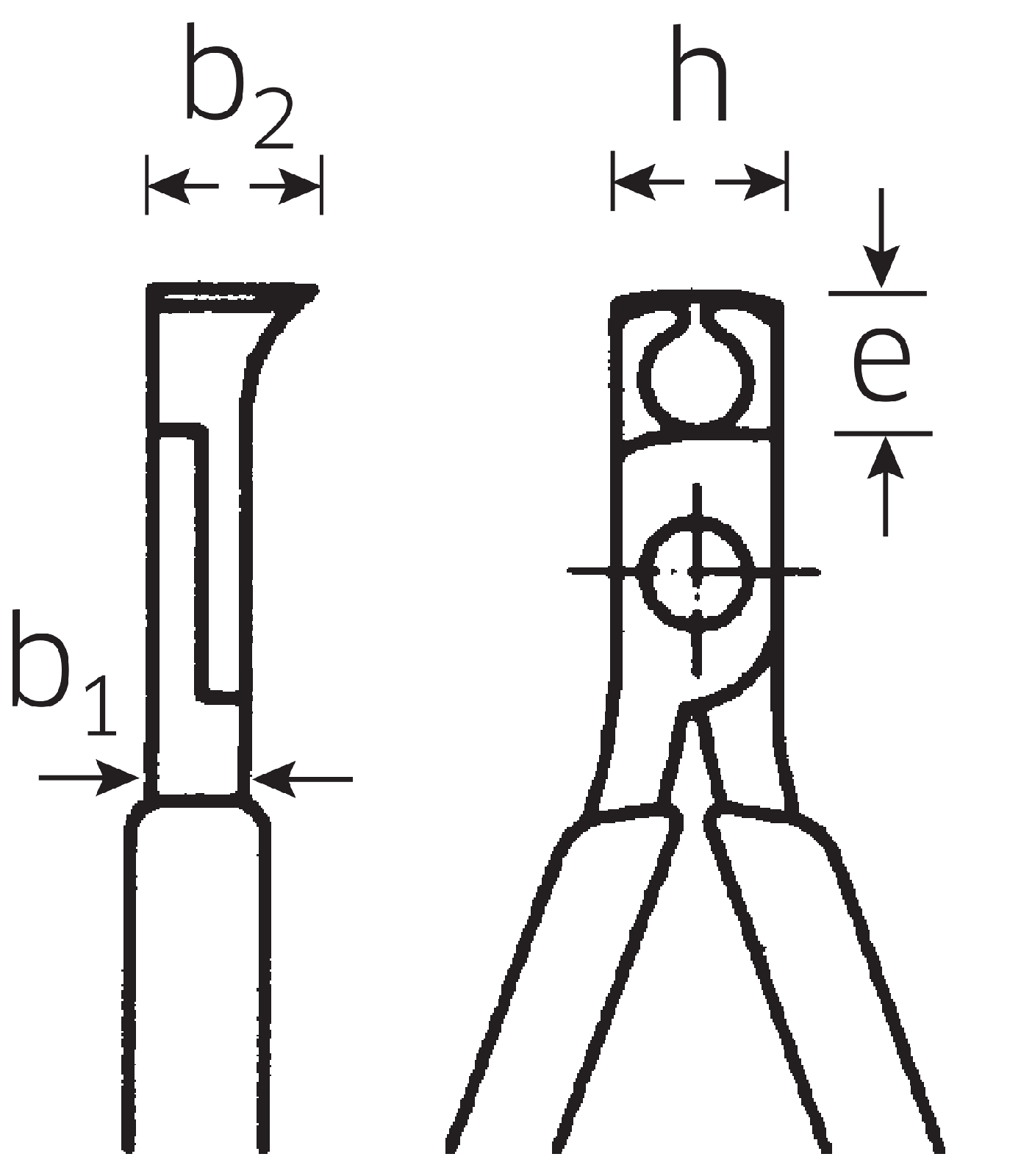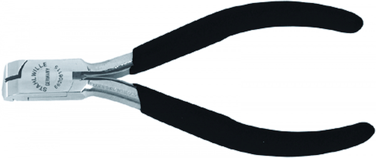 Čelní stípací kletě pro elektroniky [Z [M DIN ISO 9654, pro precizní stříhání měkkých a tvrdých drátů, s jemnou řeznou hranou ohnutou o 90°, úzká hlavice, stříhání Cu drátů o průměru 0,25 mm na pici, se zavařenou otvírací pruinou, legovaná ocel pičkové kvality, řezné hrany indukčně kaleny na cca. 60 HRC.
