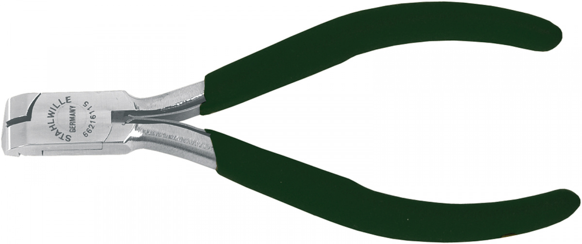 Čelní stípací kletě pro elektroniku [Z [M DIN ISO 9654, jako 6620, ale s přímou řeznou hranou, pro rovné ploné řezy, přímý řez měkkých a středně tvrdých Cu a diodových drátů, legovaná ocel pičkové kvality, řezné hrany indukčně kaleny na cca. 60 HRC.